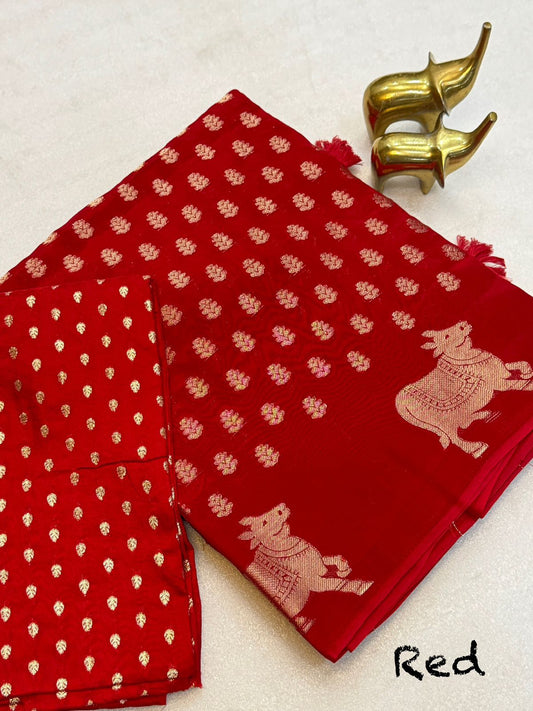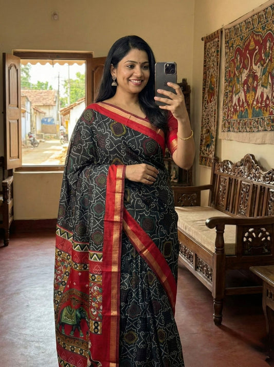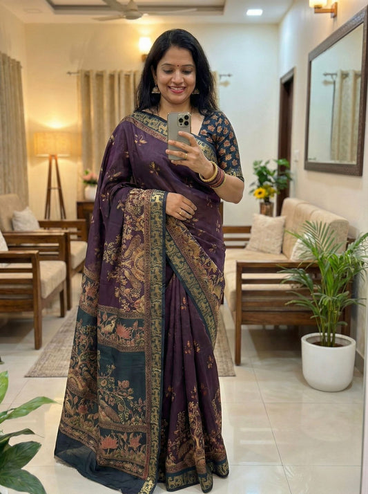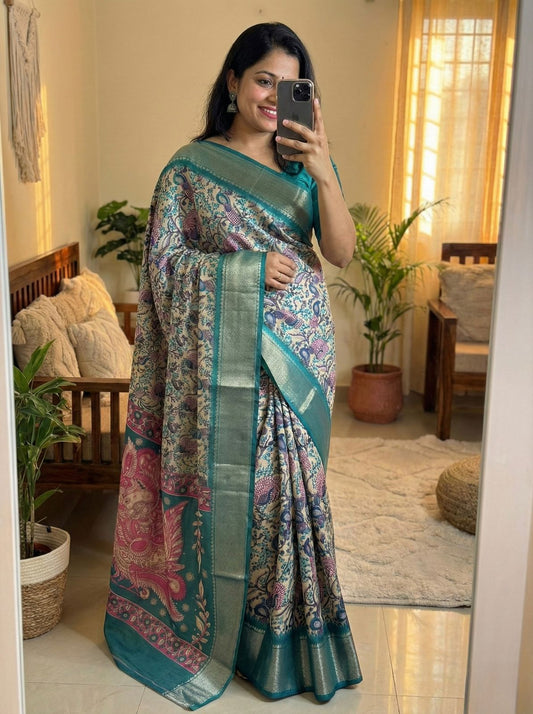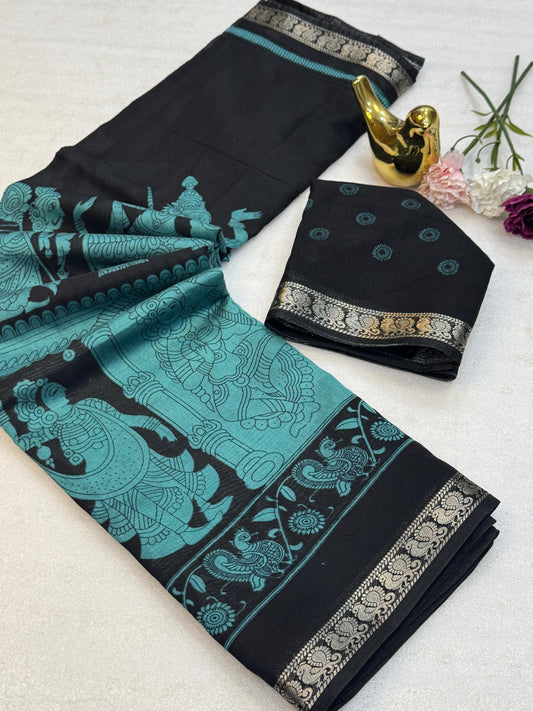 πΈ Product Details Fabric: Premium Dola Silk Print: Kalamkari print Border: Zari woven border Blouse:...