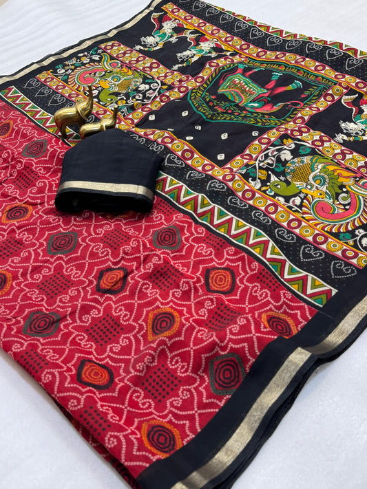 Product Details Fabric: Soft Makhmali Silk Print: Kalamkari with Bandhani digital print Border: Silver samosa...