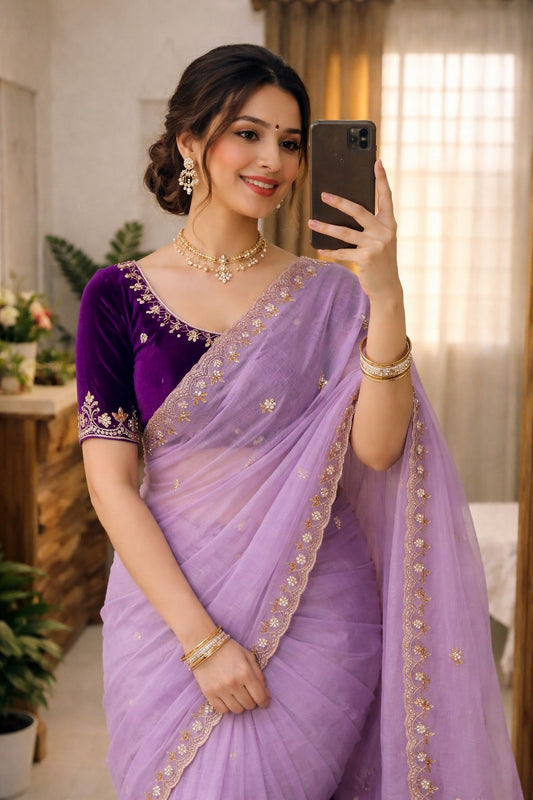 Add a touch of sophistication to your festive collection with this elegant Cruise Tissue Saree,...