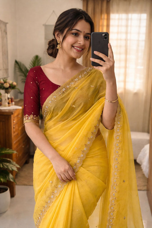 🔸 Product Details Fabric: Gold Crush Work: Heavy mirror lace border Blouse: Printed blouse with...
