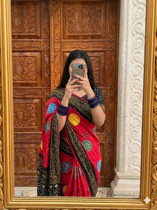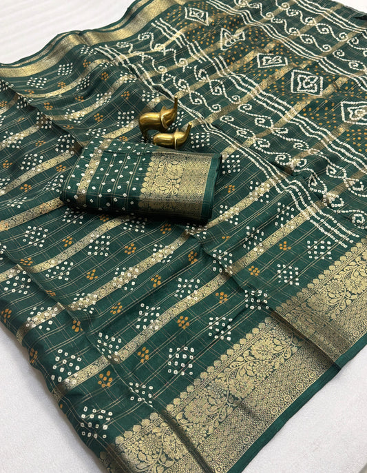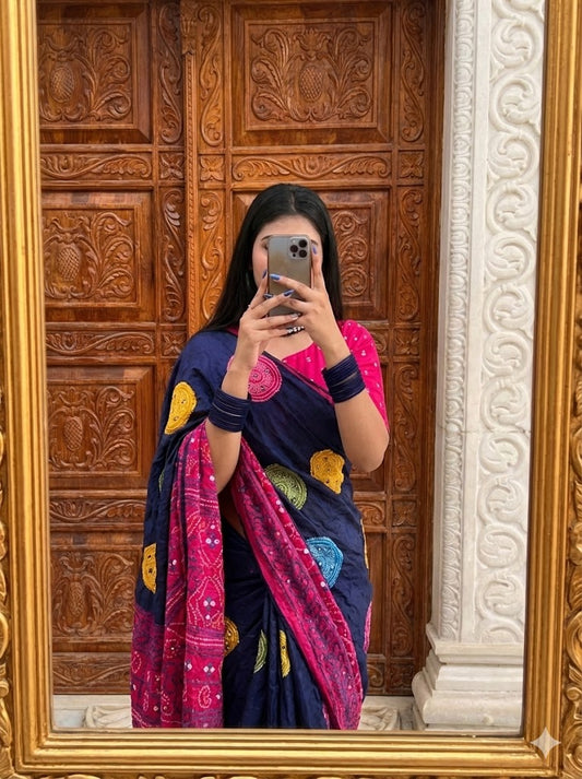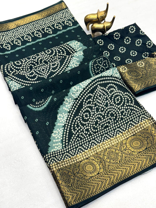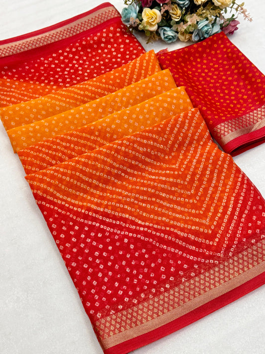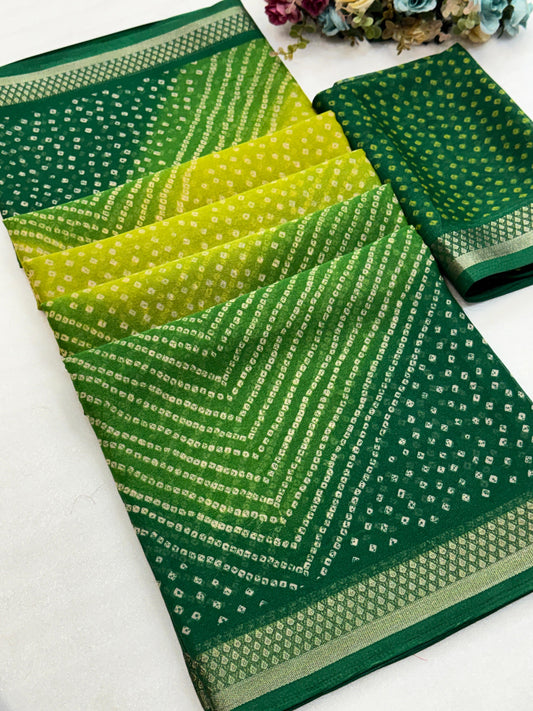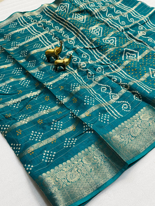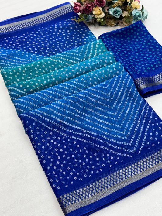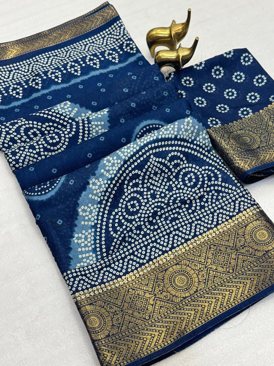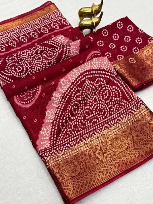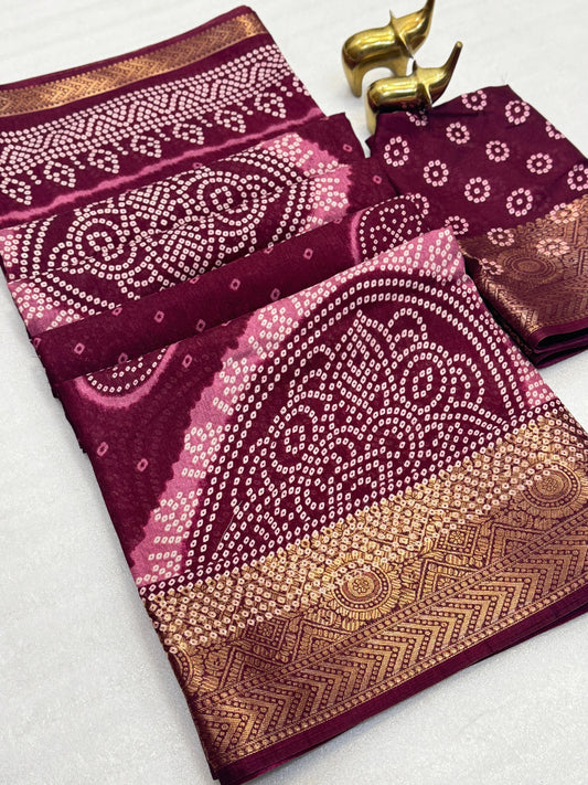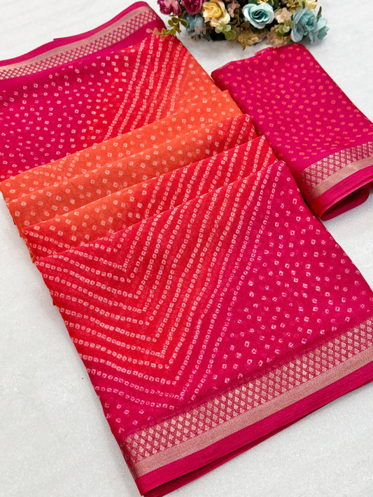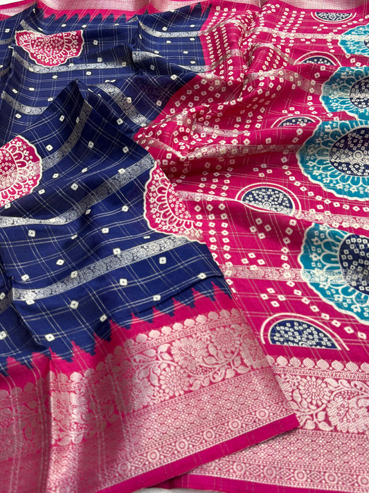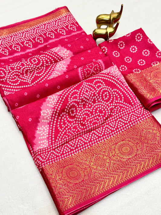 Elevate your festive wardrobe with this Beautiful Dola Silk Bandhani Saree, crafted to reflect timeless...