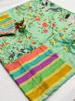 Experience timeless grace with our Handloom Tussar Silk Saree, designed with intricate Kalamkari digital prints and finished with elegant Arco borders on both sides. This saree effortlessly blends traditional charm with contemporary appeal.
