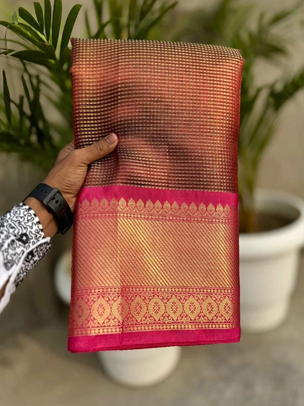 Banarasi woven soft tissue silk with all-over gold zari weaving. Beautiful two-tone fabric featuring intricate Banarasi weaving. Rich contrast pallu as shown in videos.