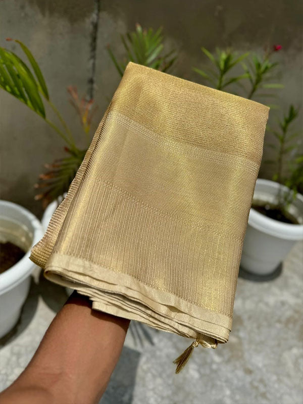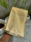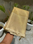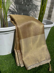 Banarasi woven soft tissue silk with all-over gold zari weaving. Beautiful two-tone fabric featuring intricate Banarasi weaving. Rich contrast pallu as shown in videos.