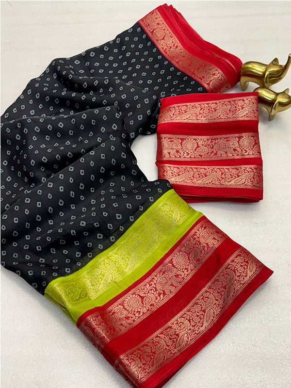The showstopper? A majestic contrast Bandhani design print that adds a vibrant, traditional twist to this modern masterpiece. Whether itβs a festive occasion or a classy get-together, this saree guarantees compliments.