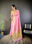 Drape yourself in tradition with this beautiful cotton saree, intricately designed with zari check weaves all over the body, offering a perfect blend of simplicity and richness. The highlight of this piece is its richly woven zari Lagadi pallu, adding a royal touch to the drape. Accentuated with a matching zari border, this saree brings out timeless elegance—ideal for festive occasions, cultural functions, or graceful everyday wear. Pair it with classic jewelry for a complete ethnic look.