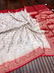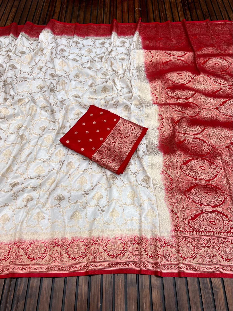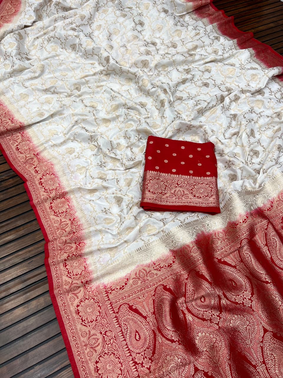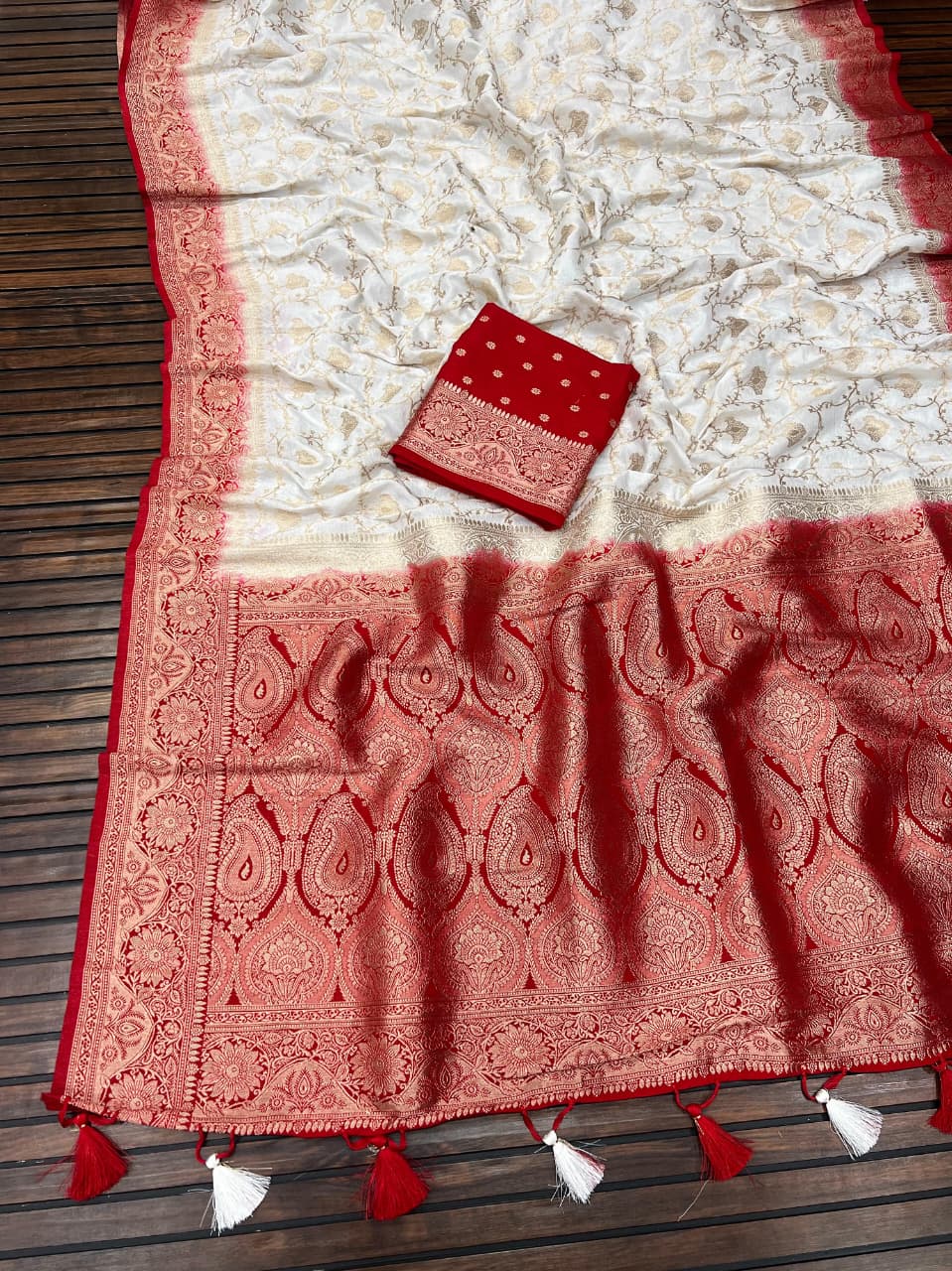 Drape yourself in tradition with this heavy Banarasi Dola Silk saree featuring rich Zari Meena jacquard weaving, elegant buttas, and a stunning pallu adorned with handmade tassels (fumka).