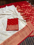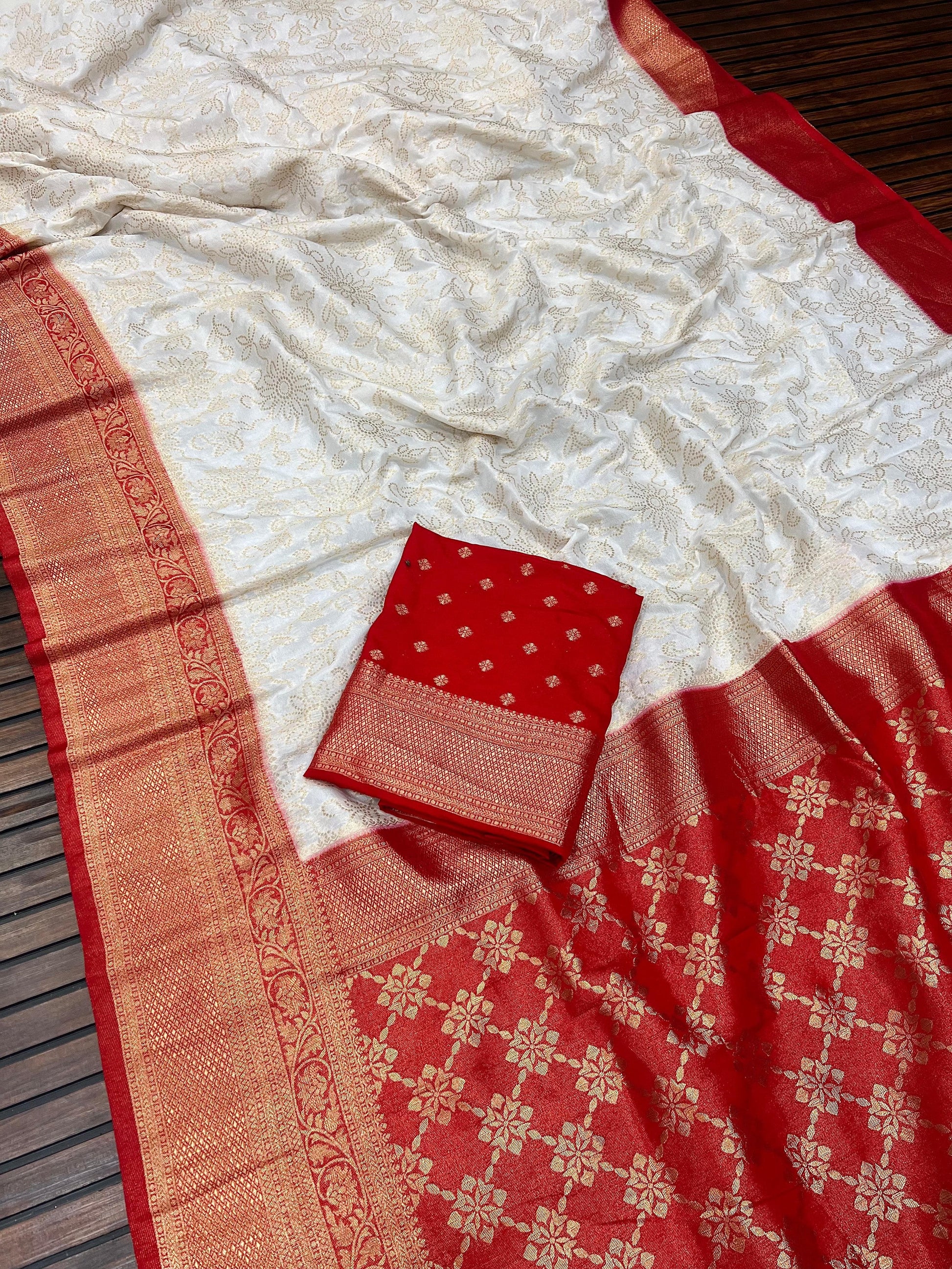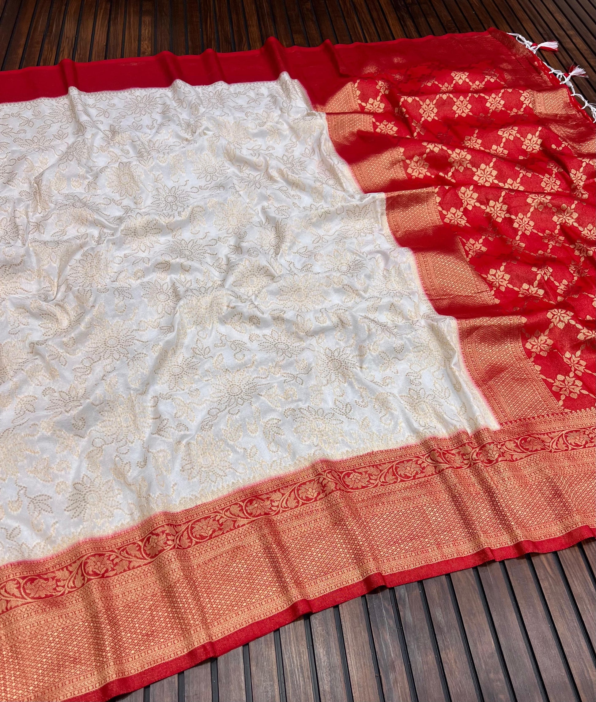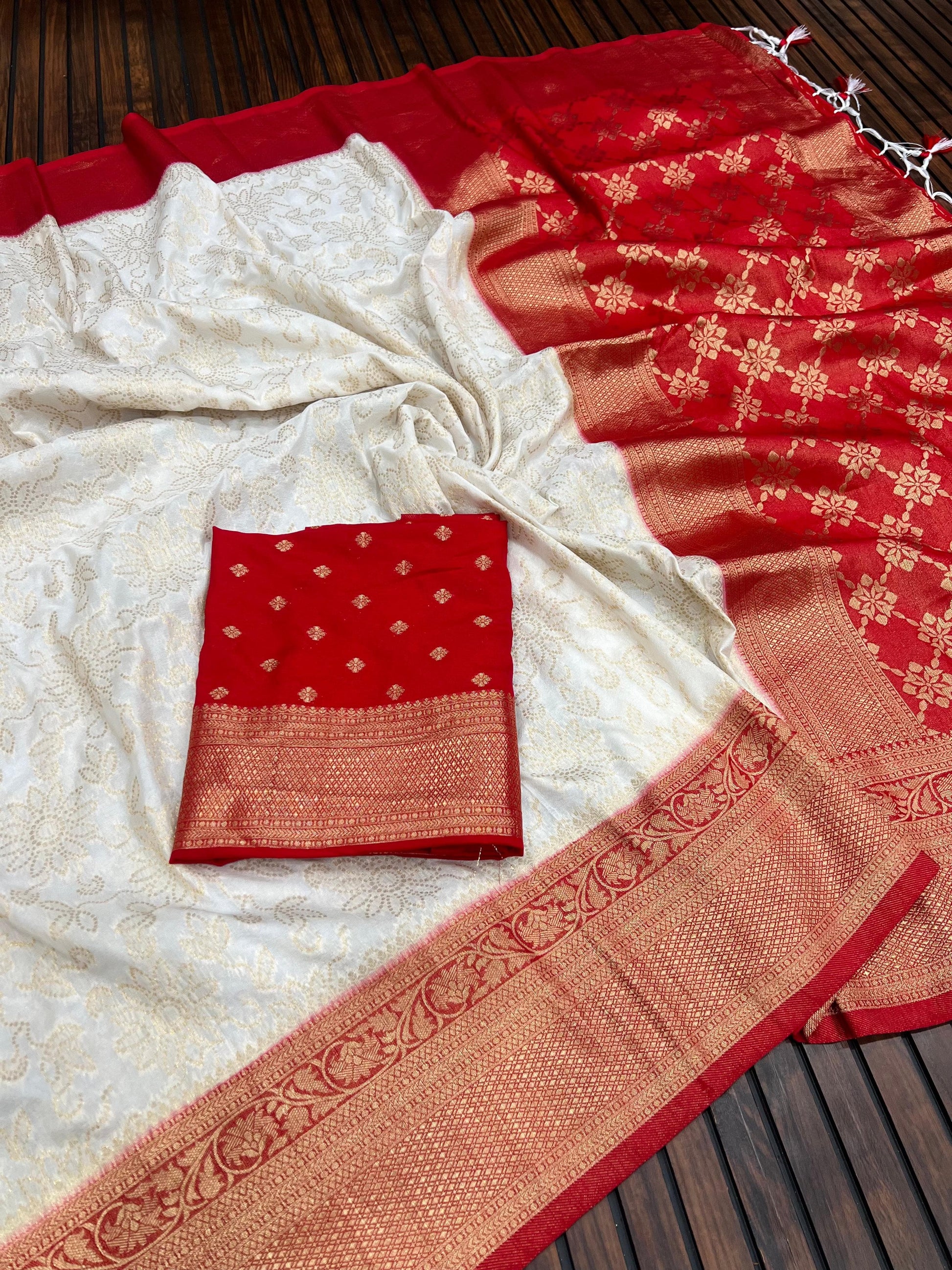 Drape yourself in tradition with this heavy Banarasi Dola Silk saree featuring rich Zari Meena jacquard weaving, elegant buttas, and a stunning pallu adorned with handmade tassels (fumka).