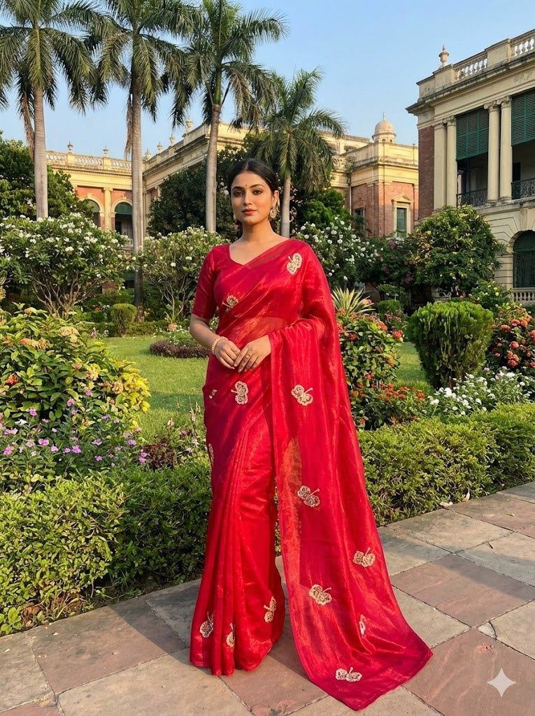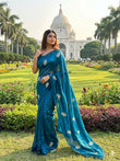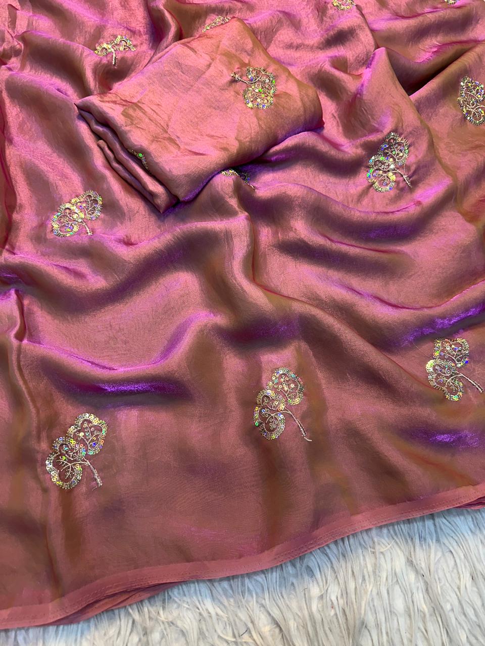 Detailed Description: Crafted from premium Fendy Satin, this saree offers a buttery-soft feel and a glossy sheen that glides effortlessly when draped. The highlight of this piece is its captivating dual-shaded color palette, creating a unique ombre effect that stands out in a crowd.