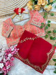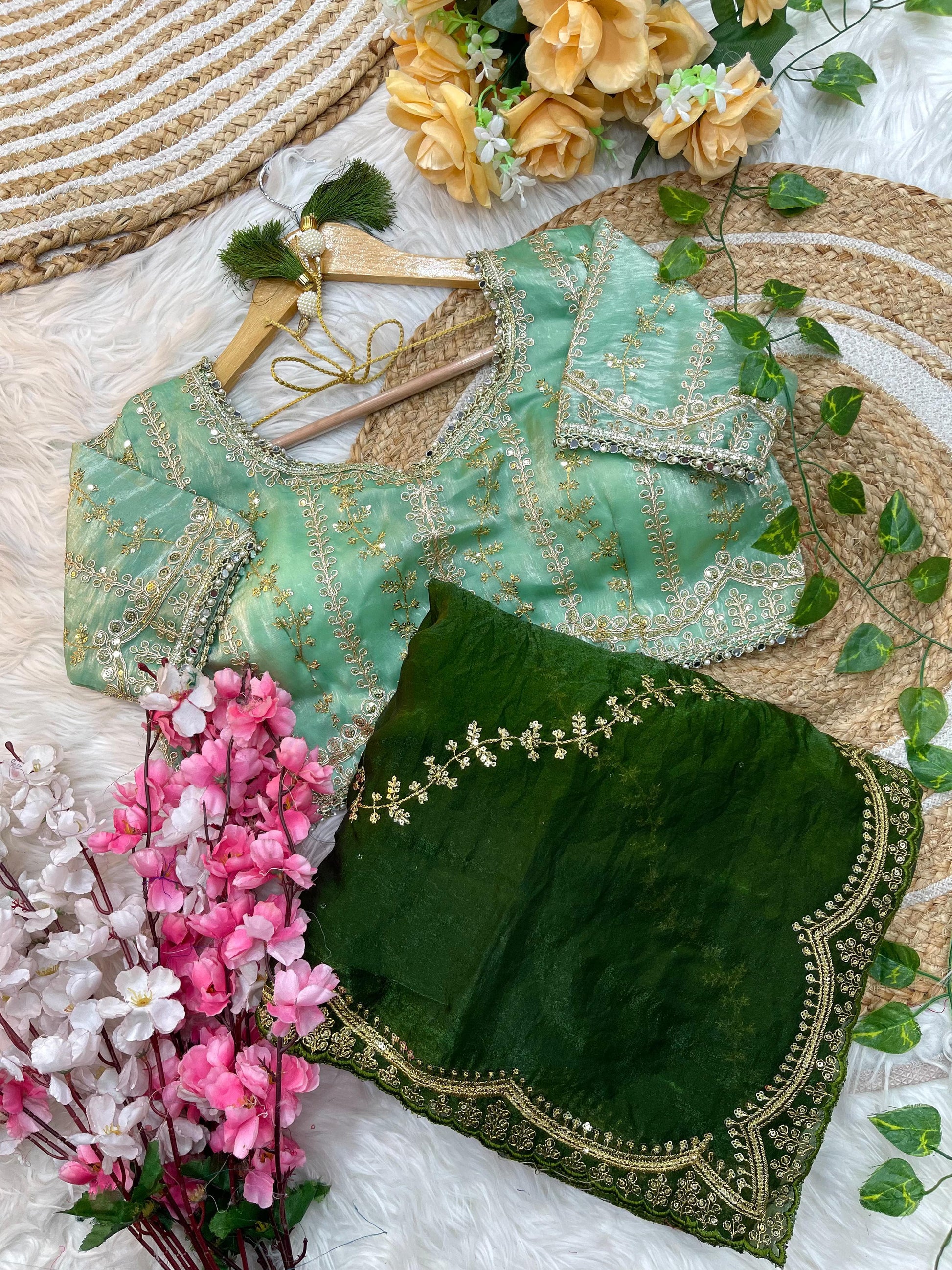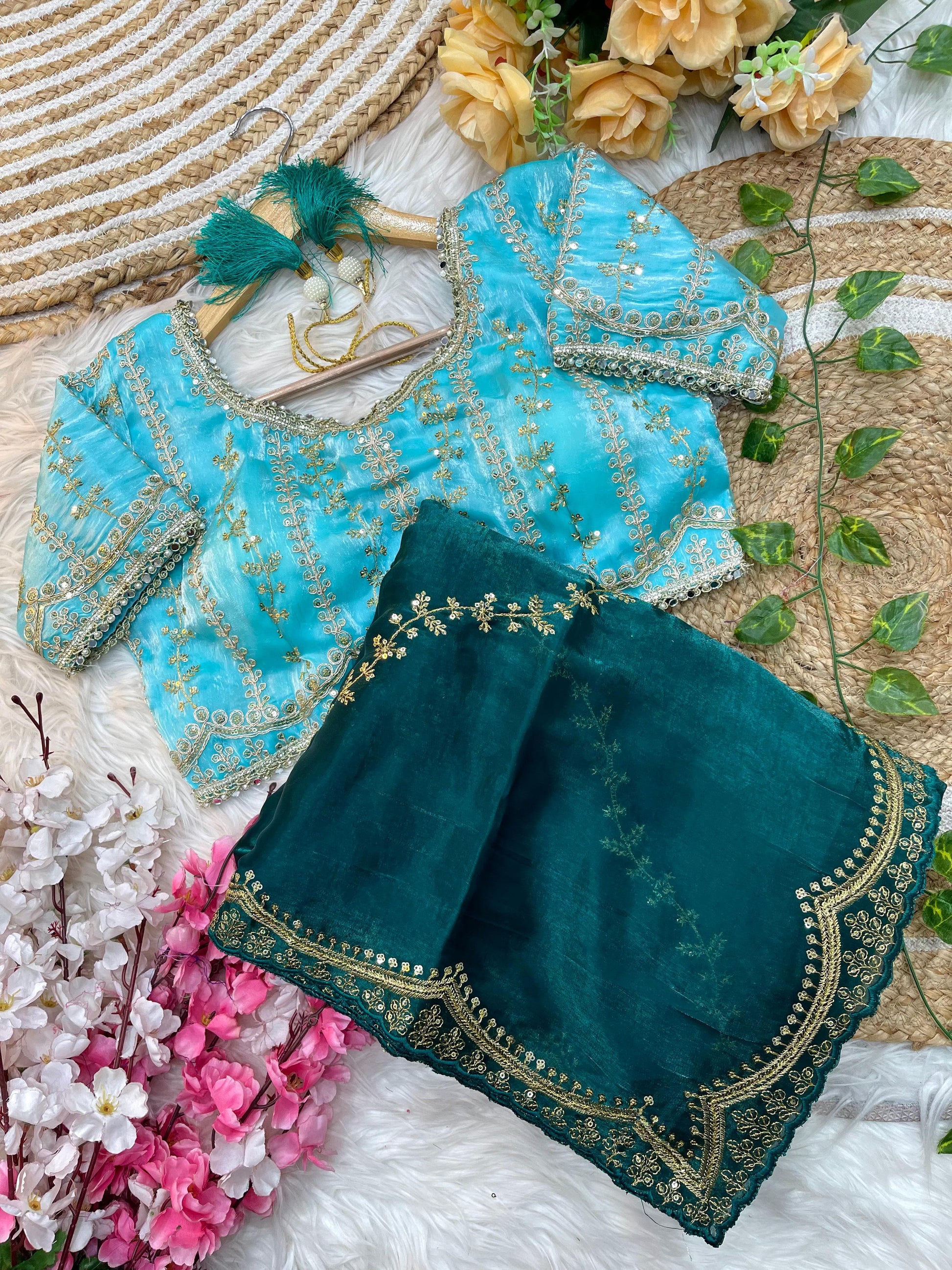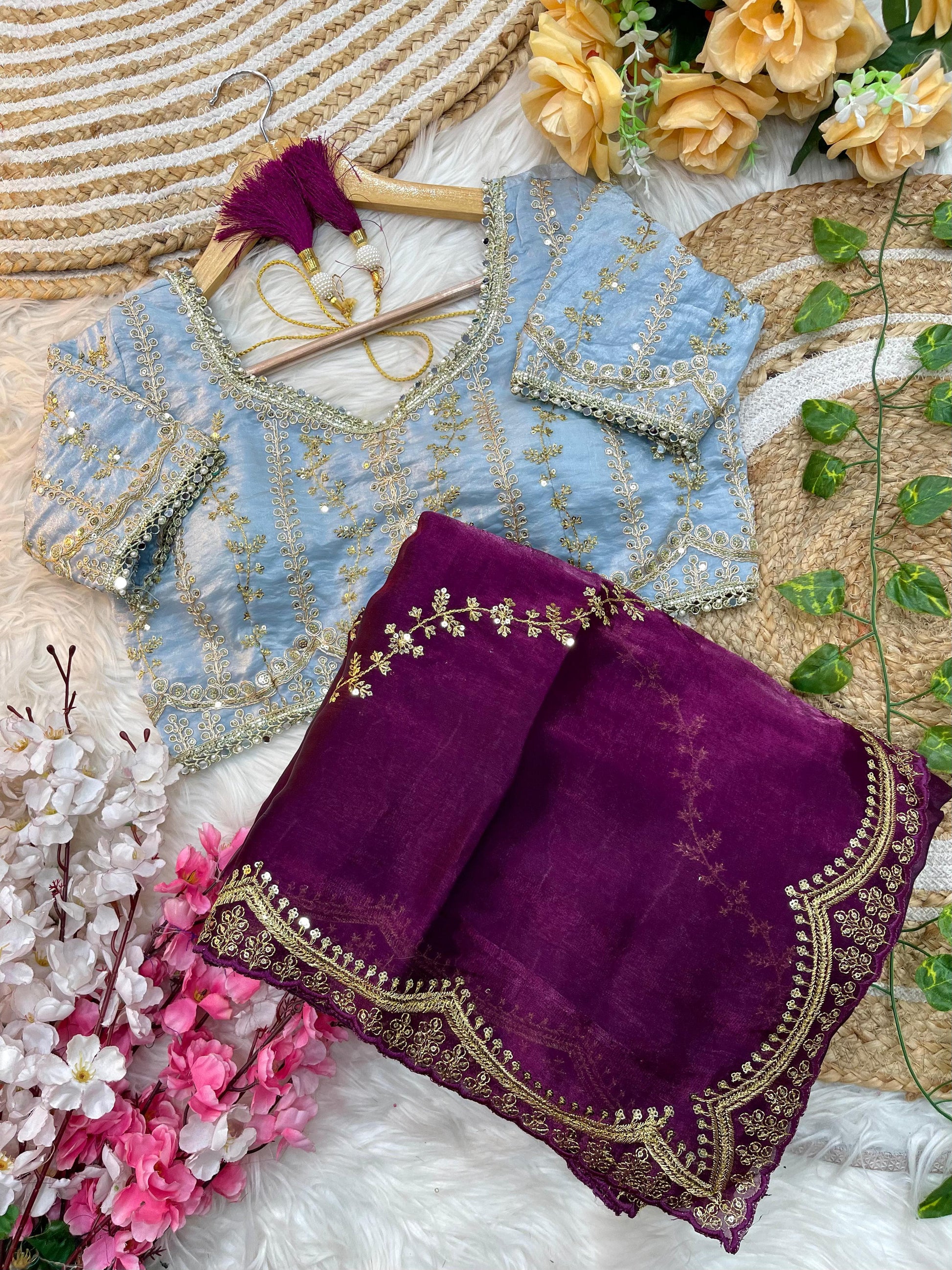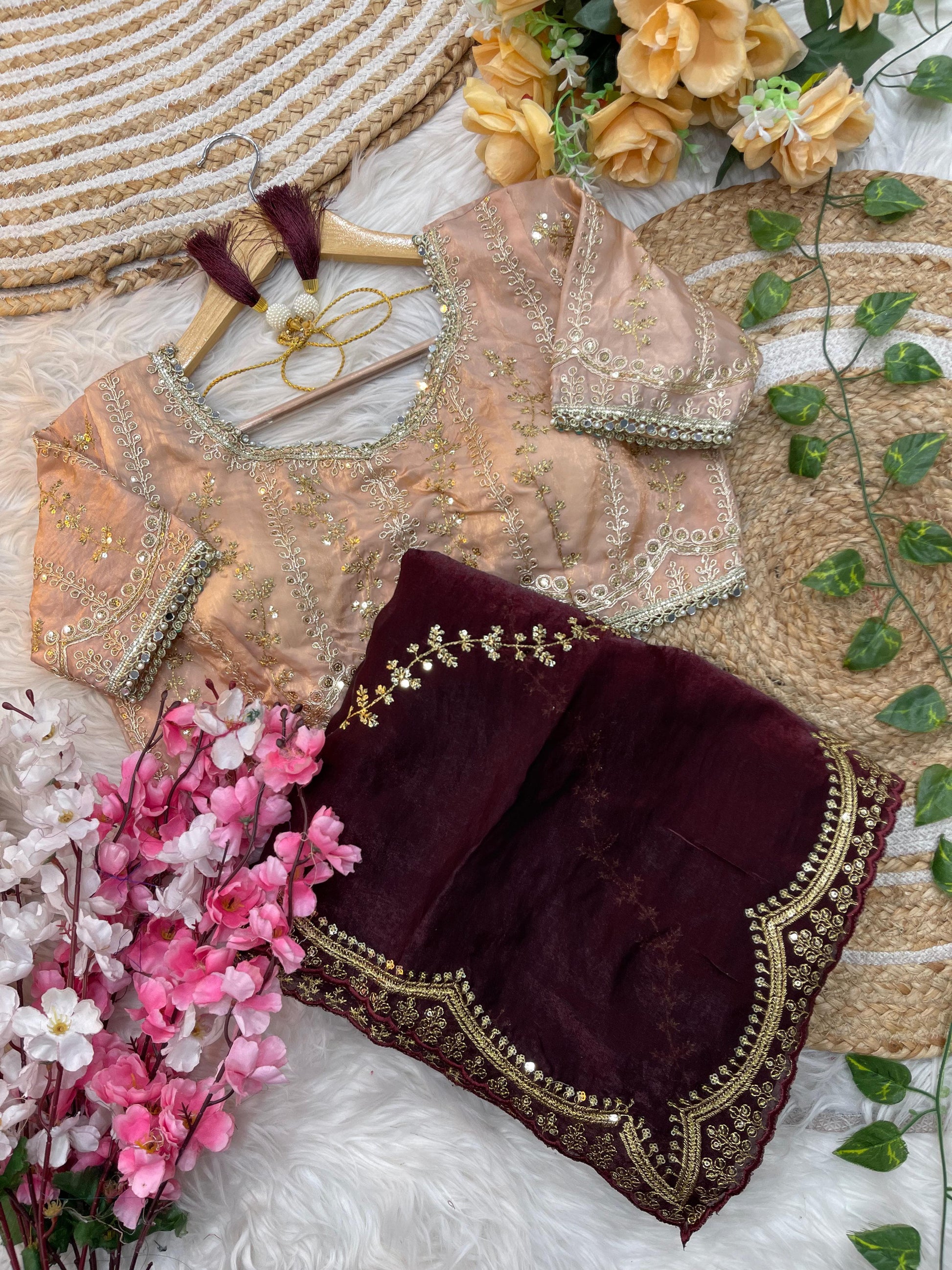 Paired with a contrast fully stitched blouse in coding embroidery work with mirror lace finishing – fits up to size 42". 💃