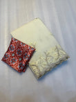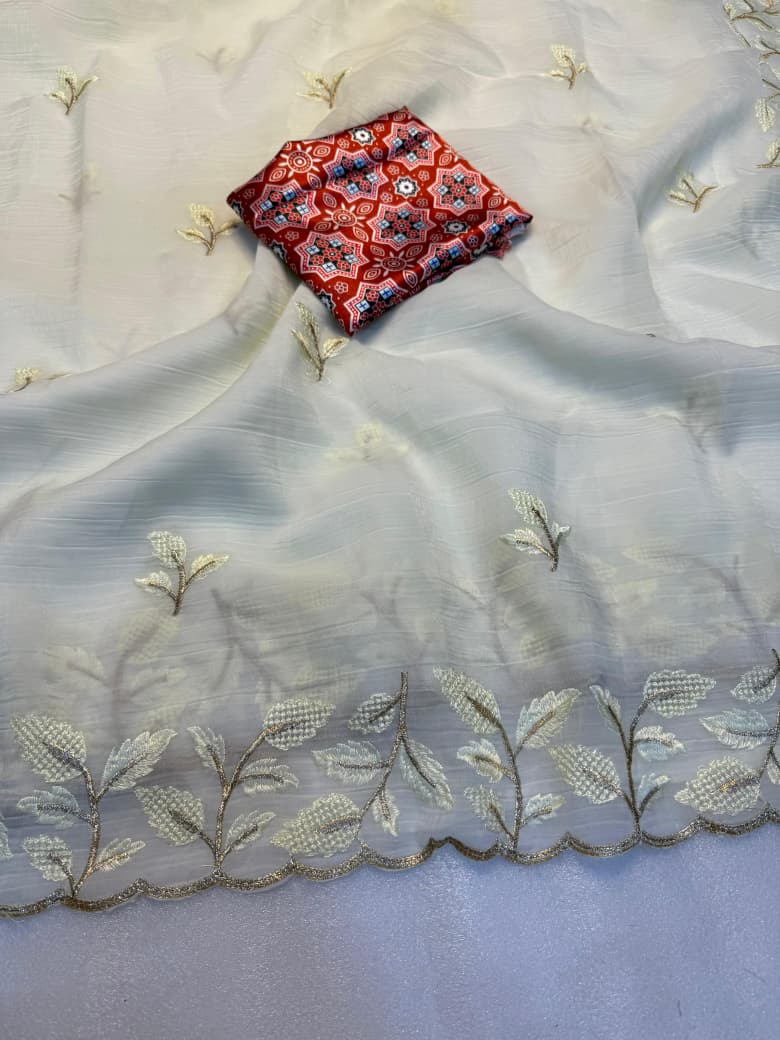 This graceful saree features delicate embroidery thread work that adds a rich traditional touch to its smooth, lustrous fabric.