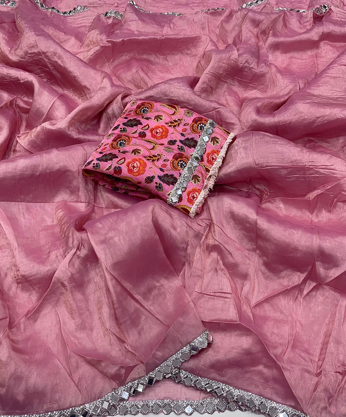 Blouse: Printed blouse with attached mirror lace (unstitched)