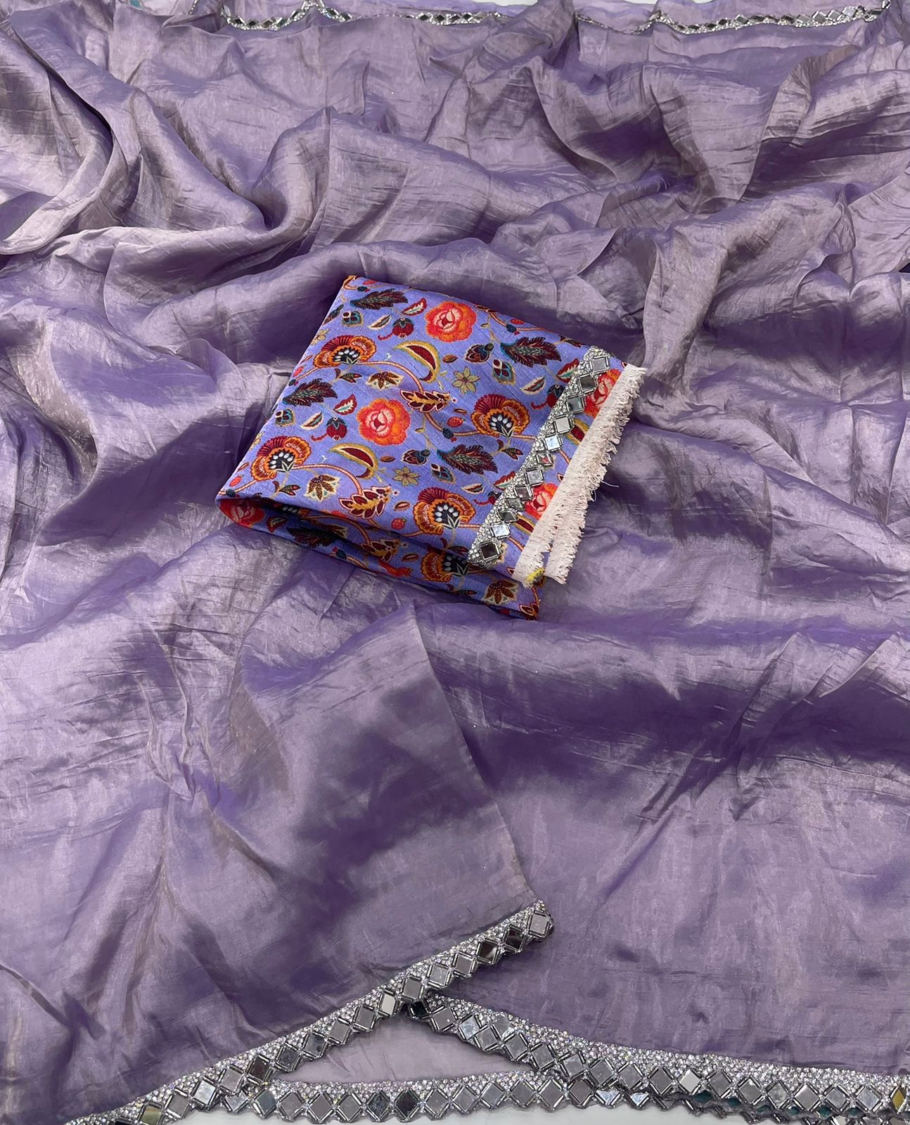 Blouse: Printed blouse with attached mirror lace (unstitched)