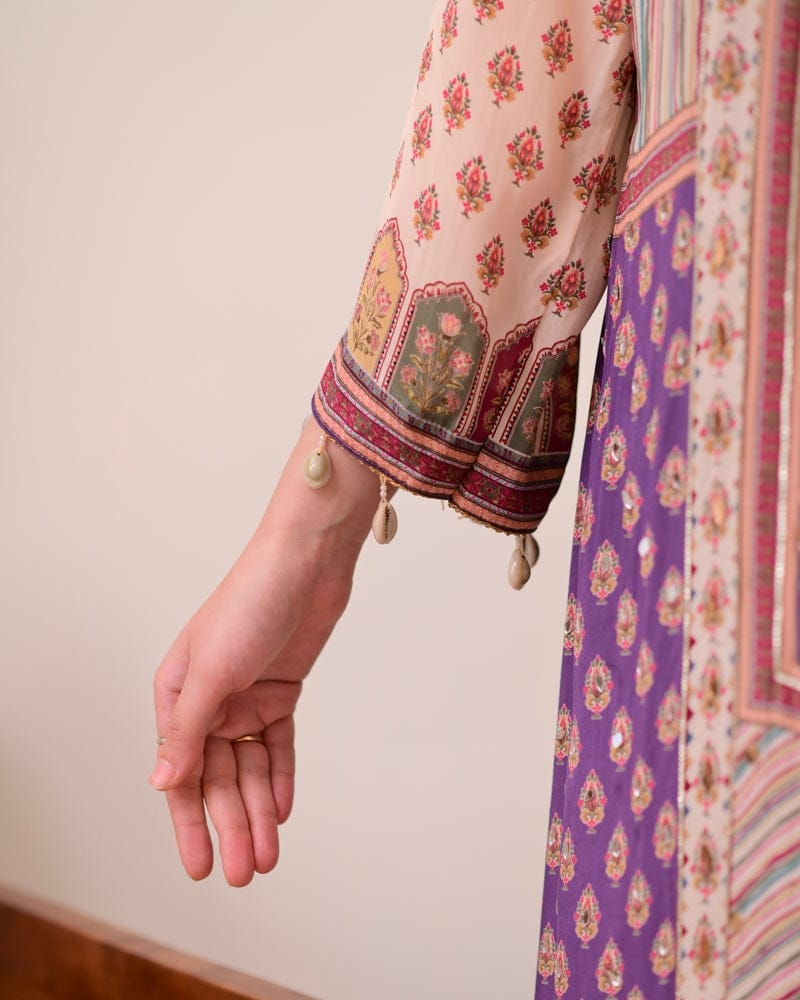 The set is paired with a borderless chiffon dupatta, giving it a lightweight and flowy charm, and comes with matching plazo pants for added comfort. To complete the ensemble, it includes a Creamy Pearl Single Line Moti Mala (4-piece set) for a touch of sophistication.