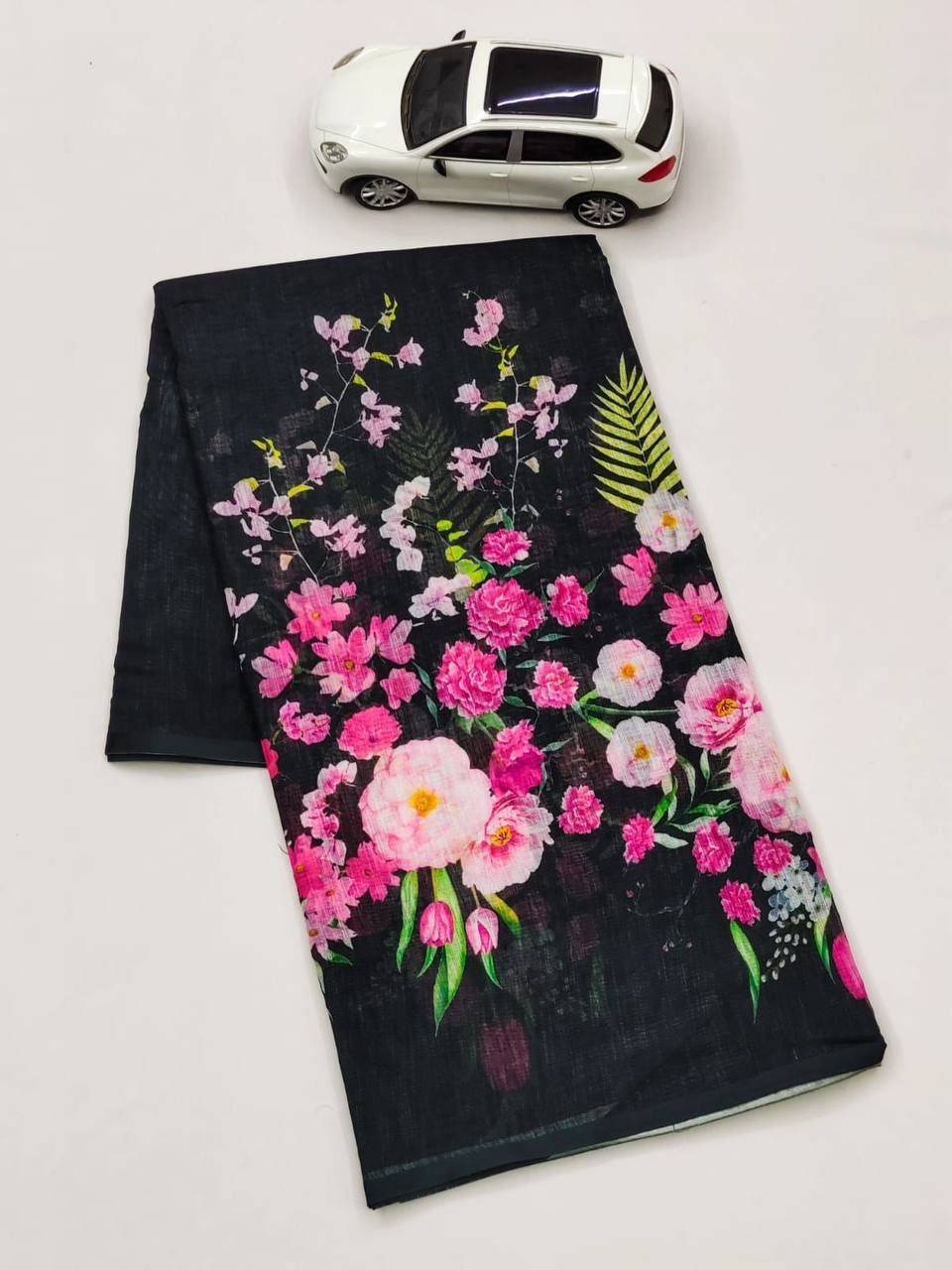 Elevate your festive wardrobe with this Linen Saree featuring silver zari patta and exquisite digital print designs. Perfect for celebrations, this saree combines elegance, comfort, and a modern touch.
