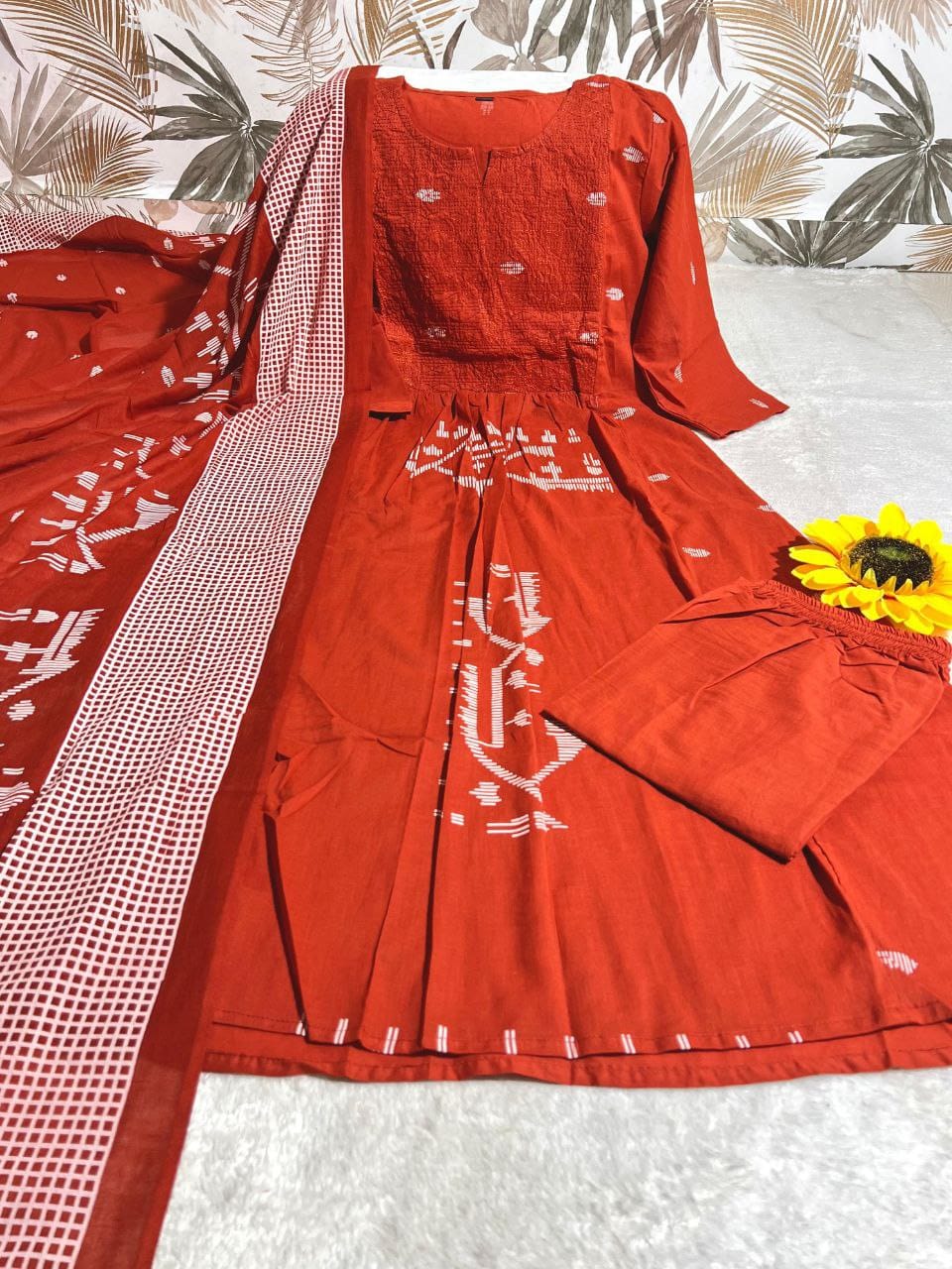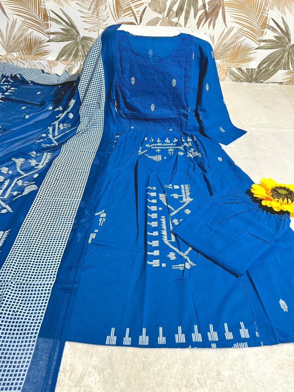 Elevate your festive wardrobe with this stunning Anarkali Kurta Set, featuring intricate embroidery and print work. Made from soft and breathable pure cotton, this set is perfect for all-day comfort without compromising on style.