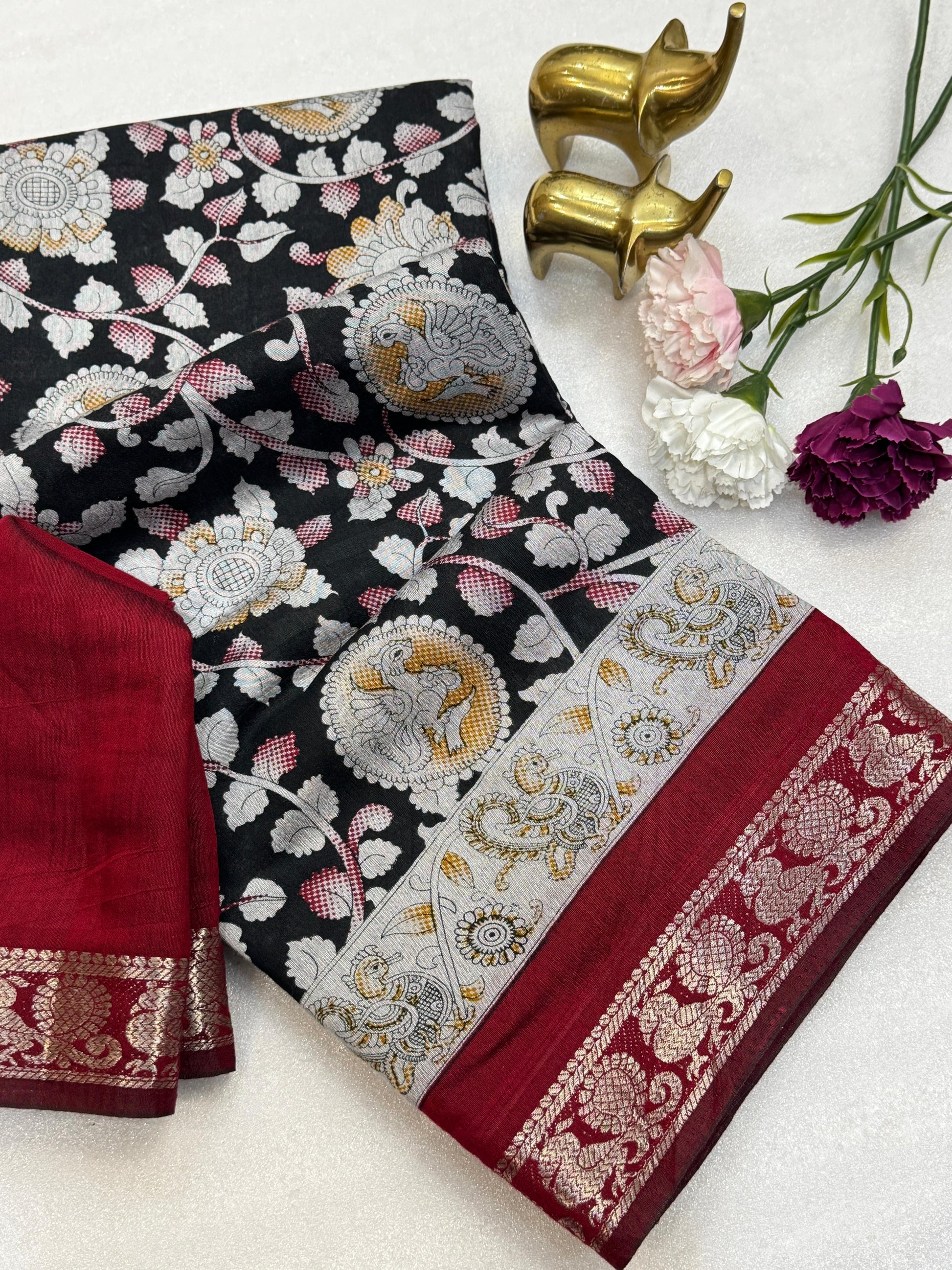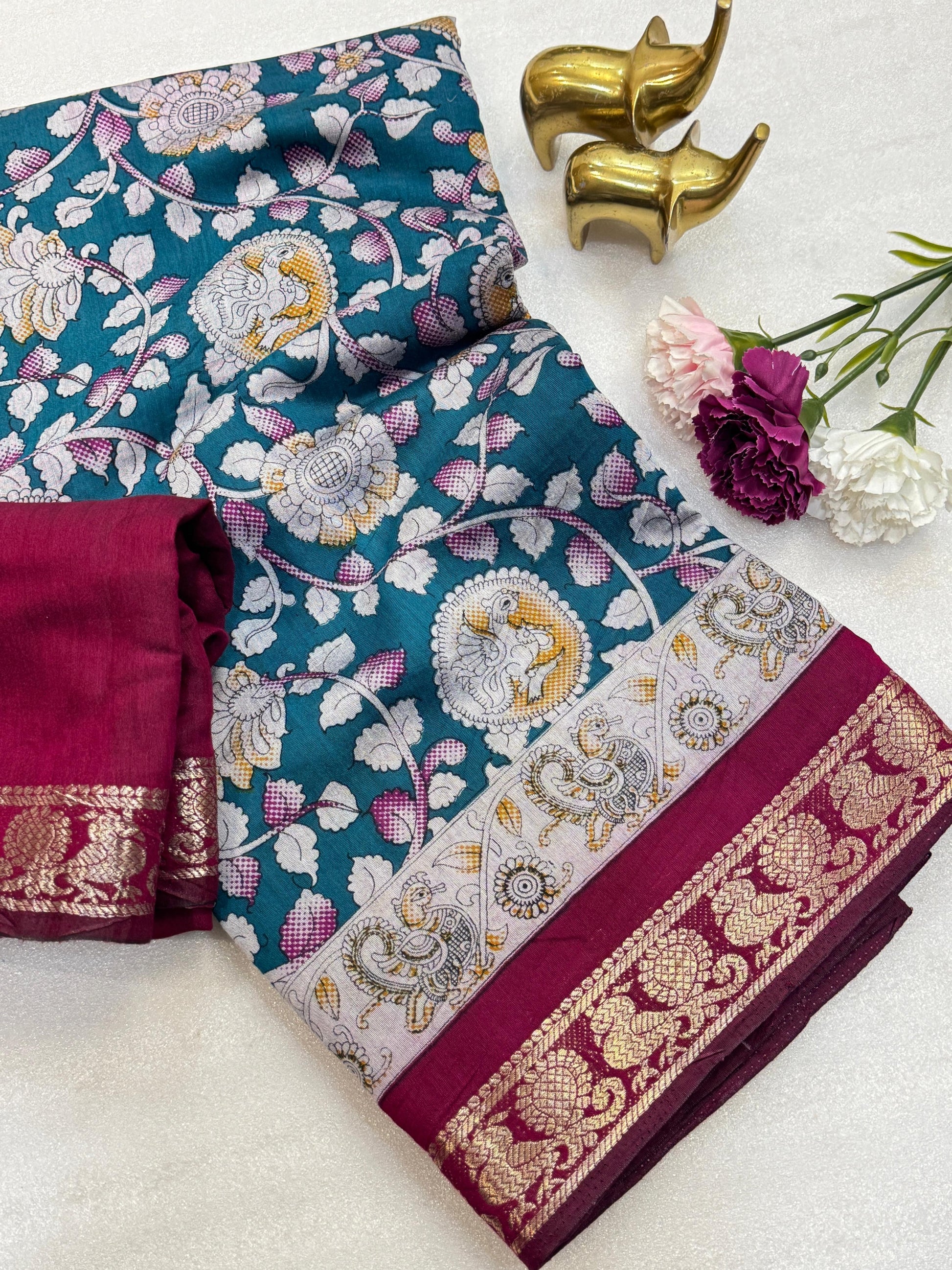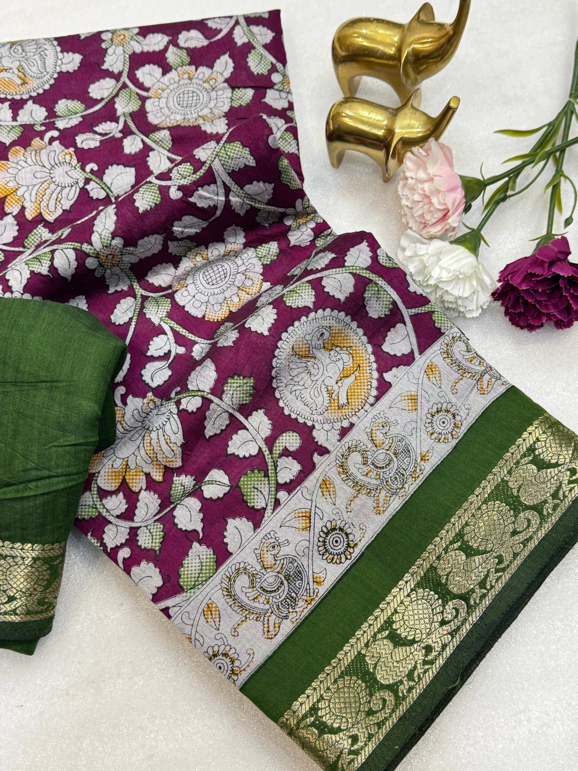 Design: All-over traditional pattern with a Kalamkari print border.