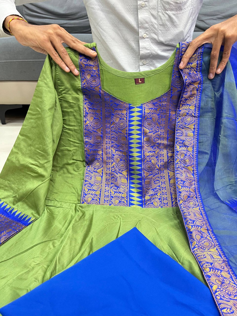 Premium Mul Chanderi fabric for a rich, festive shine