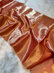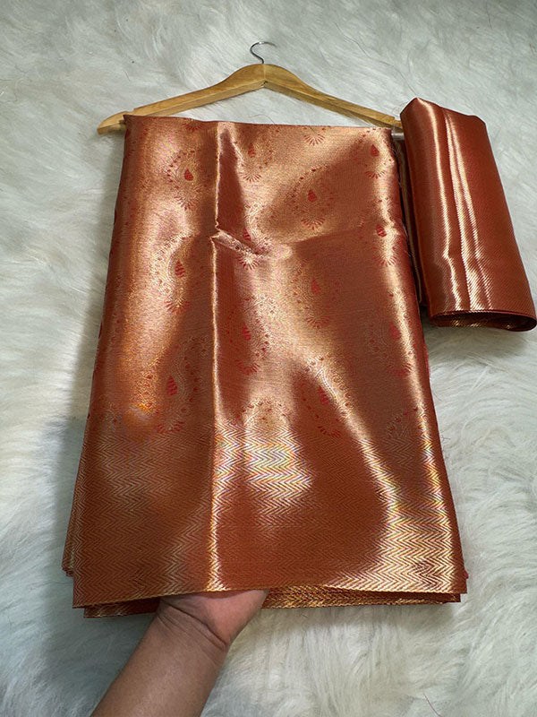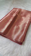 Banarasi woven soft tissue silk with all-over gold zari weaving. Beautiful two-tone fabric featuring intricate Banarasi weaving. Rich contrast pallu as shown in videos.