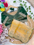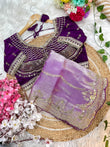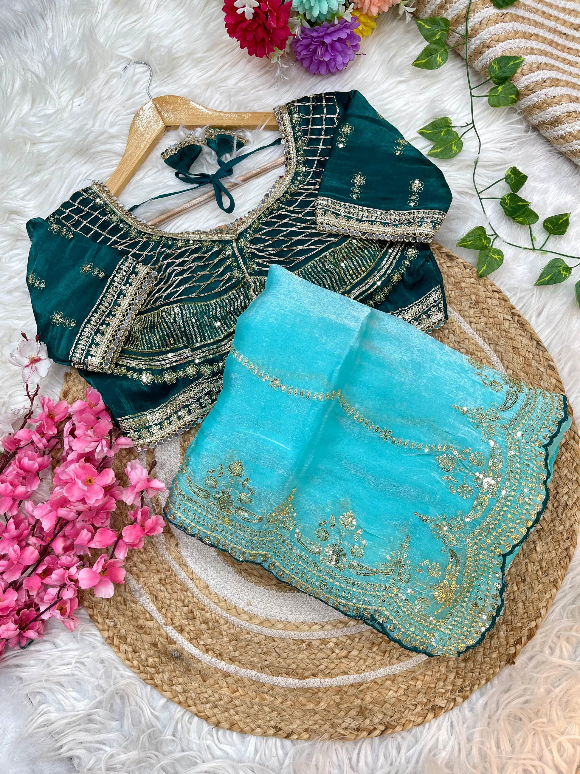 Comes with a fully stitched contrast blouse in cording embroidery + sequence work, mirror lace accents, and stylish fancy latkans. A look made to stand out at weddings, sangeets, and evening parties. š