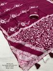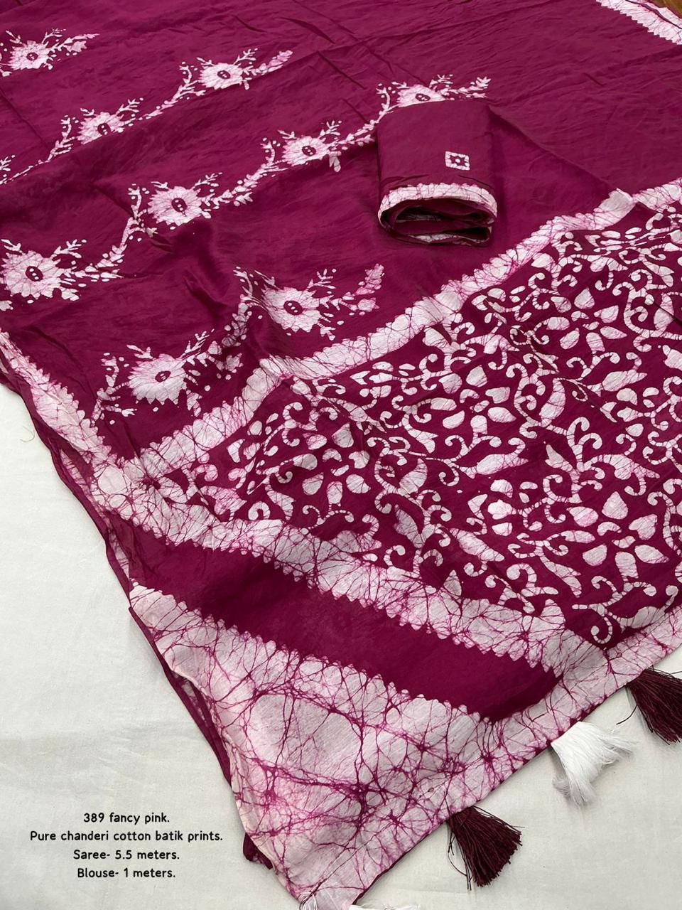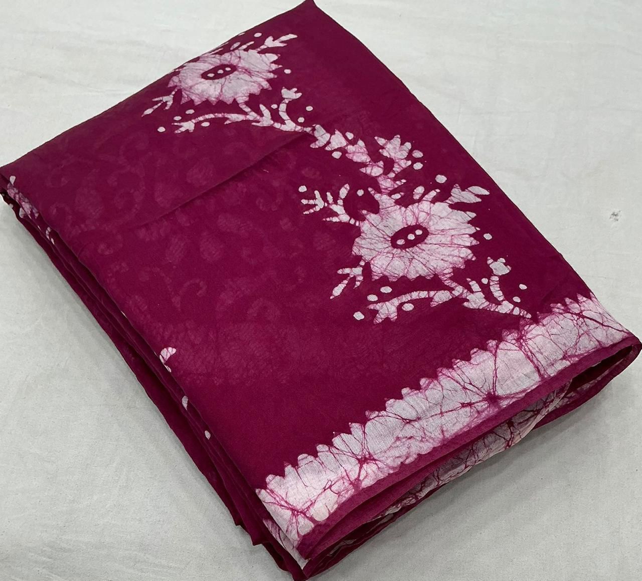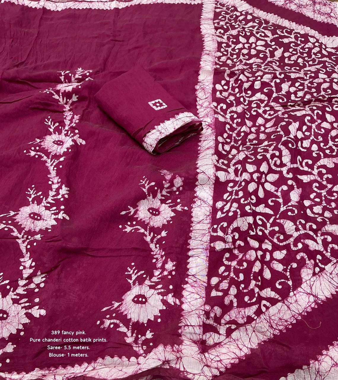 Drape yourself in subtle sophistication with this pure Chanderi cotton saree featuring intricate batik floral prints all over. Lightweight, breathable, and effortlessly elegant — paired with a running Chanderi cotton blouse in matching batik design