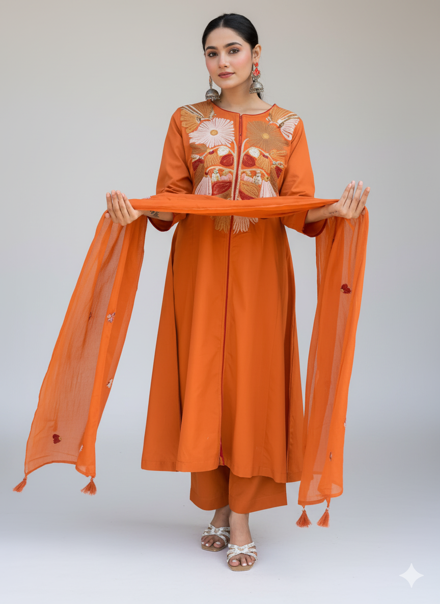 Add a splash of color to your festive wardrobe with this Pure Mul Cotton 60×60 Kurti Pant Dupatta Set. Designed with vibrant detailing on the yoke and a flattering pleated kurti, this ensemble pairs beautifully with matching pants and a complementing dupatta, making it perfect for both festive and casual occasions.