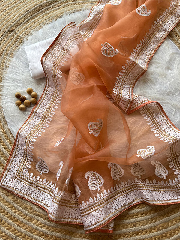 Pure Organza Silk Saree with Elegant Embroidery Work & Raw Silk Plain Blouse | Lucknowi LookSA625-770