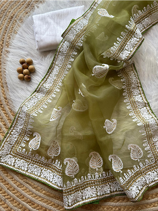 Pure Organza Silk Saree with Elegant Embroidery Work & Raw Silk Plain Blouse | Lucknowi LookSA625-771