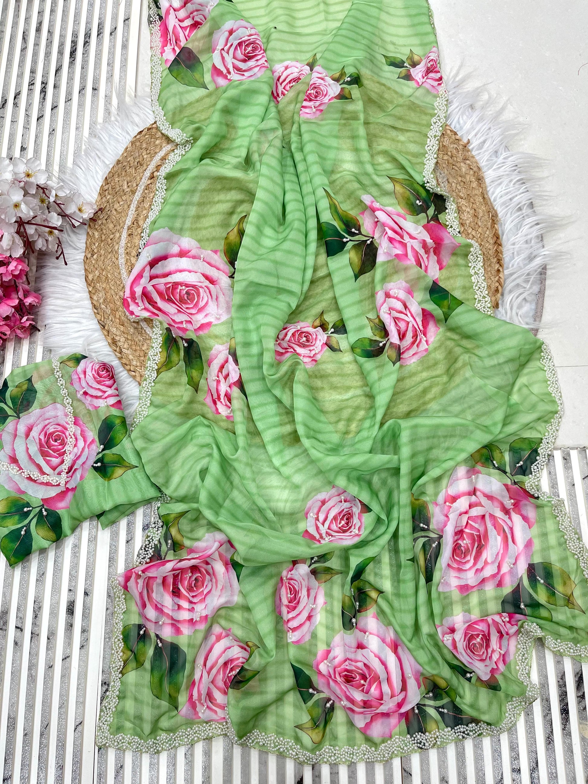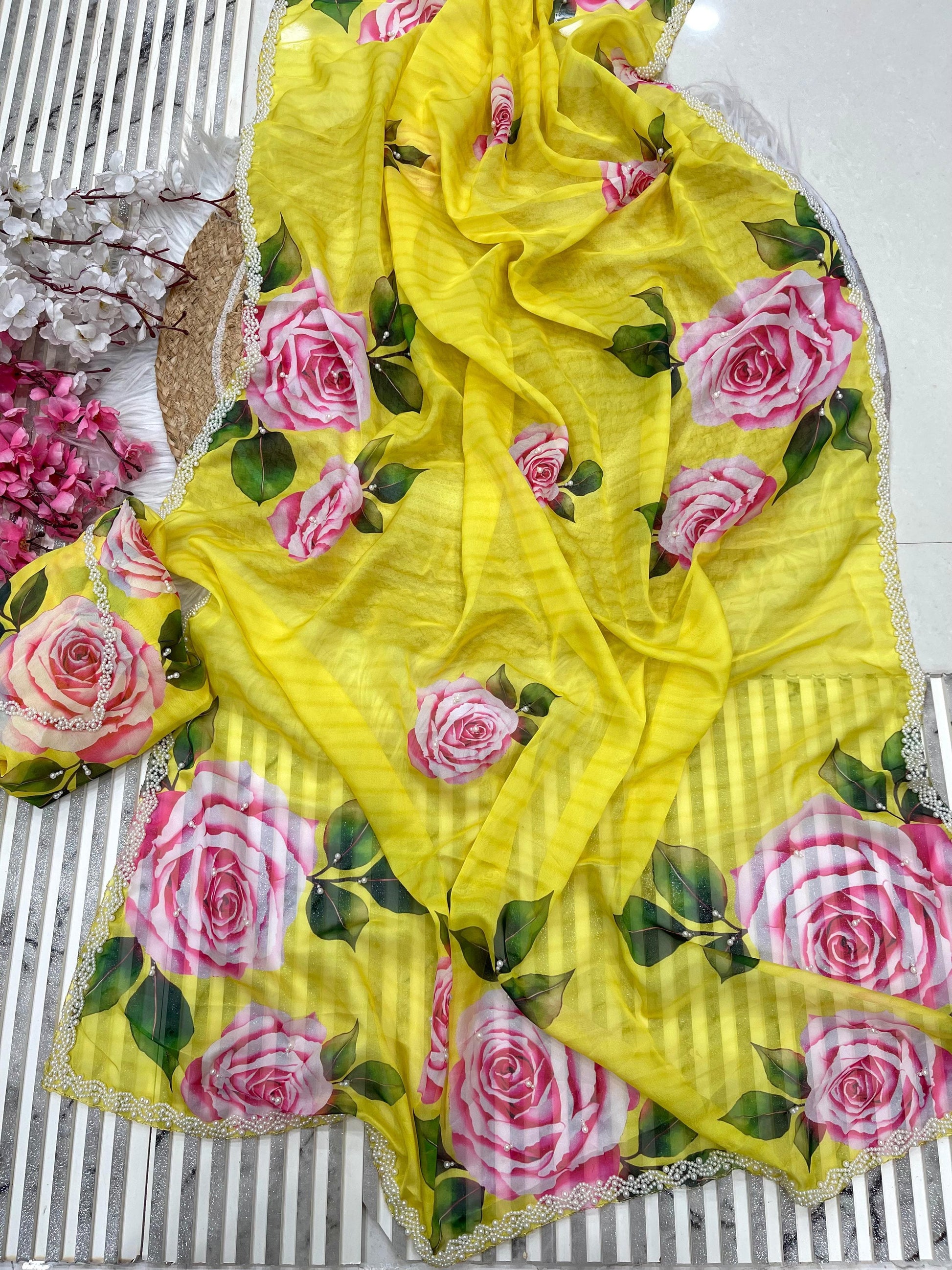 Float into grace with this pure soft organza teby silk saree, adorned with delicate floral prints, enhanced with khatli handwork border, cutdana detailing, and aarco embellishment — perfect for weddings and elegant gatherings. 💫