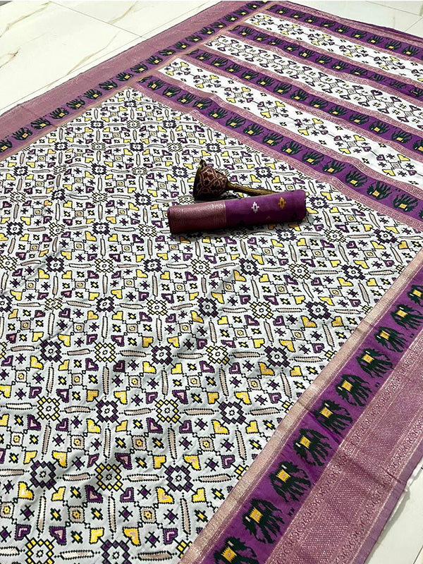 Pure Patola Silk Saree, crafted to perfection with authentic Meenakari designs and intricate heavy weaving work. The saree is elevated by a striking heavy zari contrast border, adding a regal touch to your look.