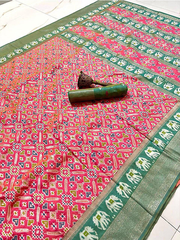 Pure Patola Silk Saree, crafted to perfection with authentic Meenakari designs and intricate heavy weaving work. The saree is elevated by a striking heavy zari contrast border, adding a regal touch to your look.