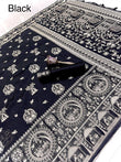It comes with a matching running blouse featuring an elegant zari border, completing the regal appeal of this ensemble. Perfect for festive occasions, weddings, and cultural celebrations.