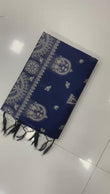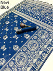 It comes with a matching running blouse featuring an elegant zari border, completing the regal appeal of this ensemble. Perfect for festive occasions, weddings, and cultural celebrations.