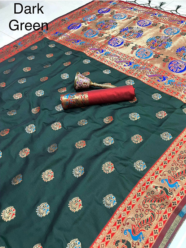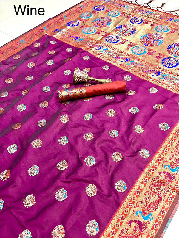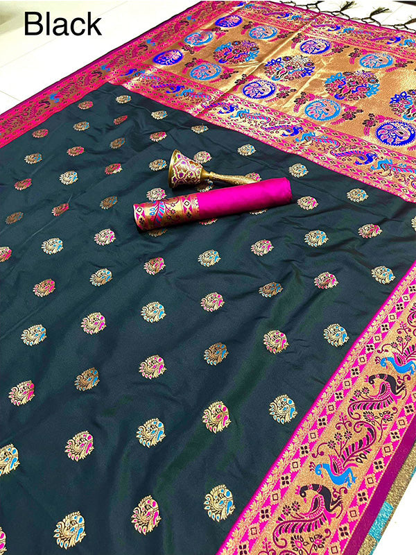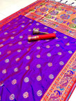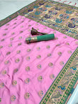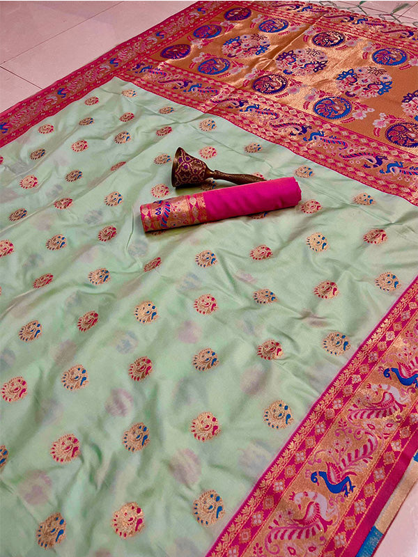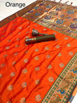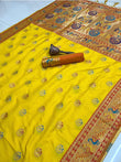 Discover timeless elegance with this Pure Soft Gold Zari Kanchivaram Paithani Silk Saree, featuring a stunning contrast peacock border that adds regal charm. The saree is adorned with a magnificently crafted heavy Mina Zari weaving pallu, blending heritage craftsmanship with luxurious appeal. Perfect for weddings, festive events, and special occasions, this masterpiece is a celebration of tradition and sophistication.