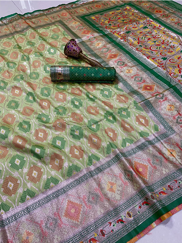 Elevate your ethnic style with this Pure Heavy Soft Silk Patola Saree, crafted with original zari butta design and adorned with a rich, traditional Meenakari woven pallu. The intricate detailing and heavy weaving make this saree a masterpiece of craftsmanship and timeless beauty.
