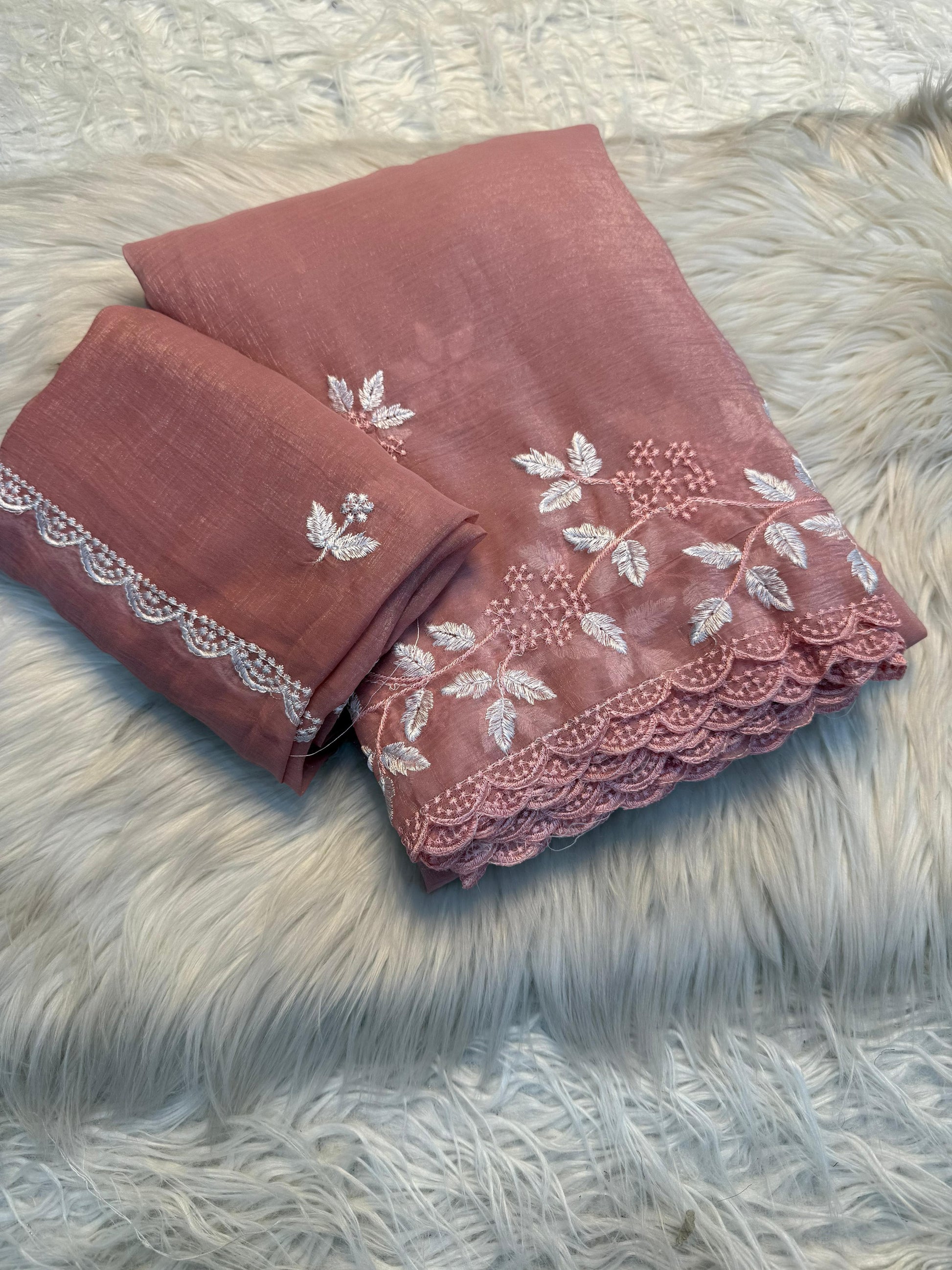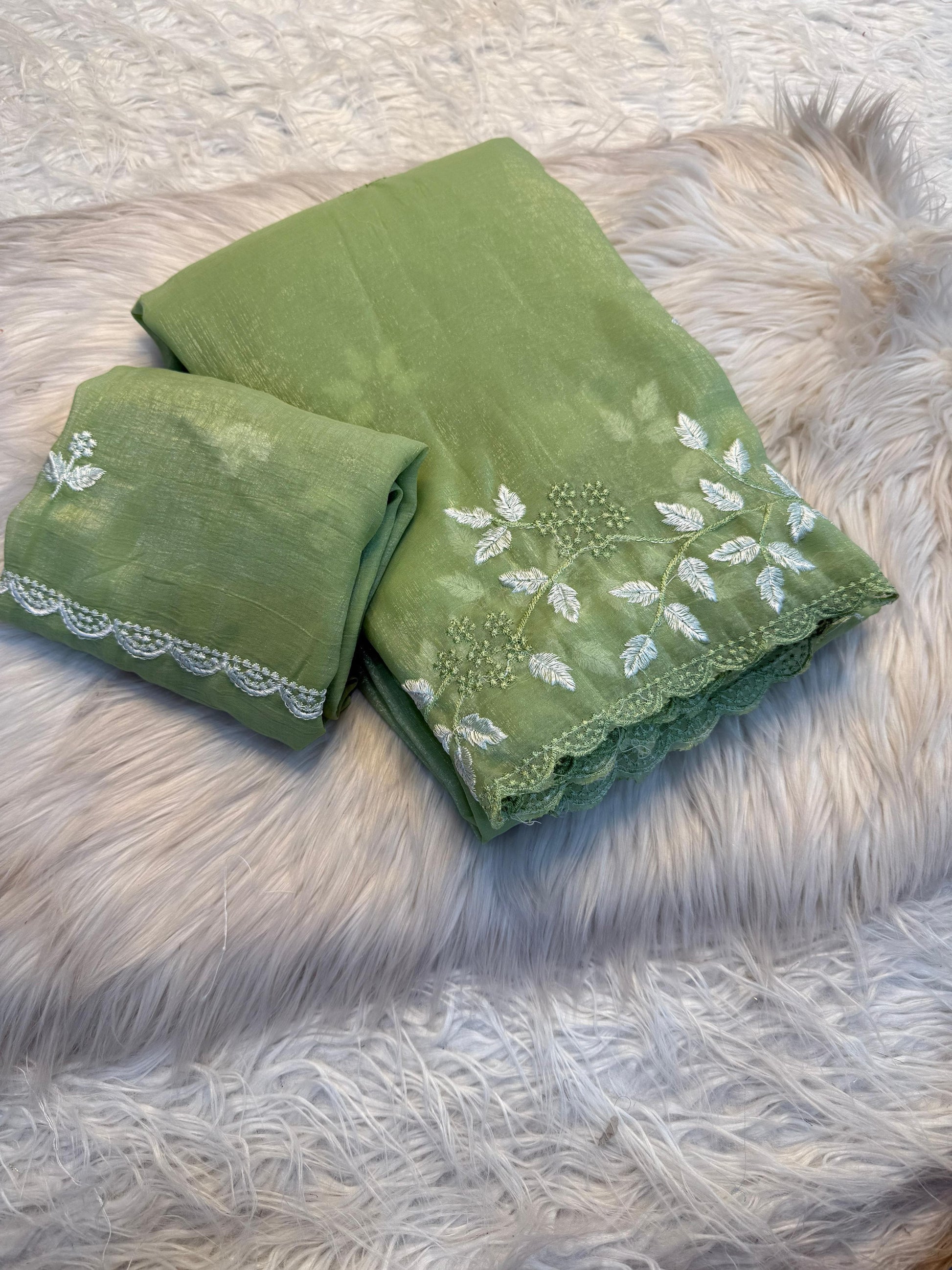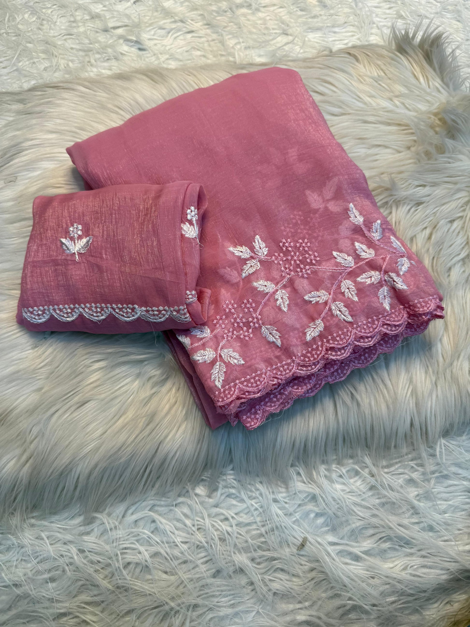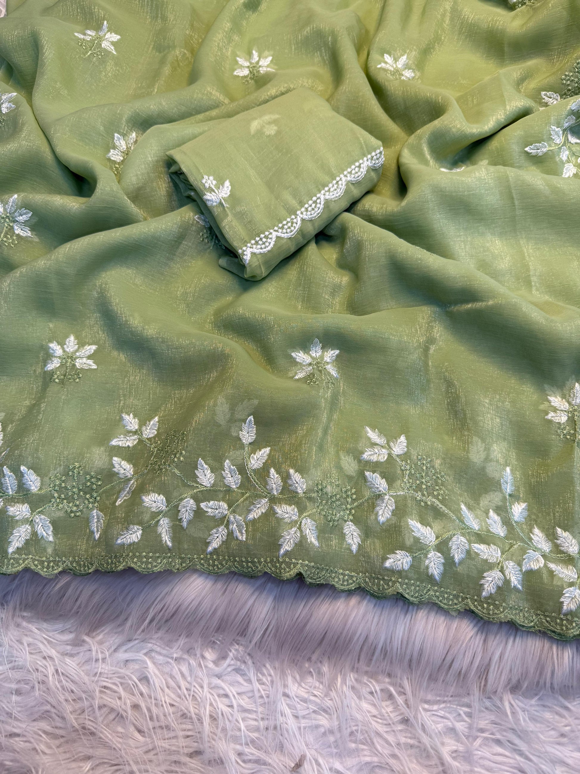 The saree is adorned with beautiful white thread leaf work design all over, complemented by scallop edge borders that add a delicate feminine charm.