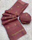 The saree features beautiful jacquard leaf figure designs all over, highlighted by a sleek satin border on both sides that adds a touch of luxury.
