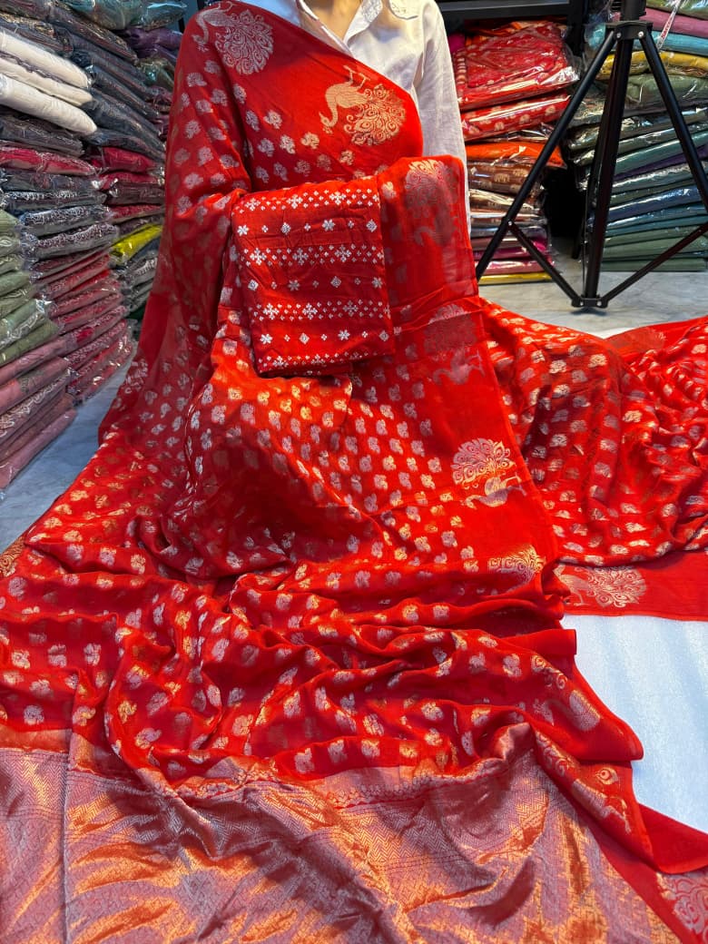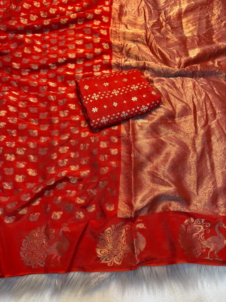 Experience royal elegance with our Pure Viscose Russian Dola Saree, designed with intricate peacock jacquard zari motifs that exude luxury and tradition.