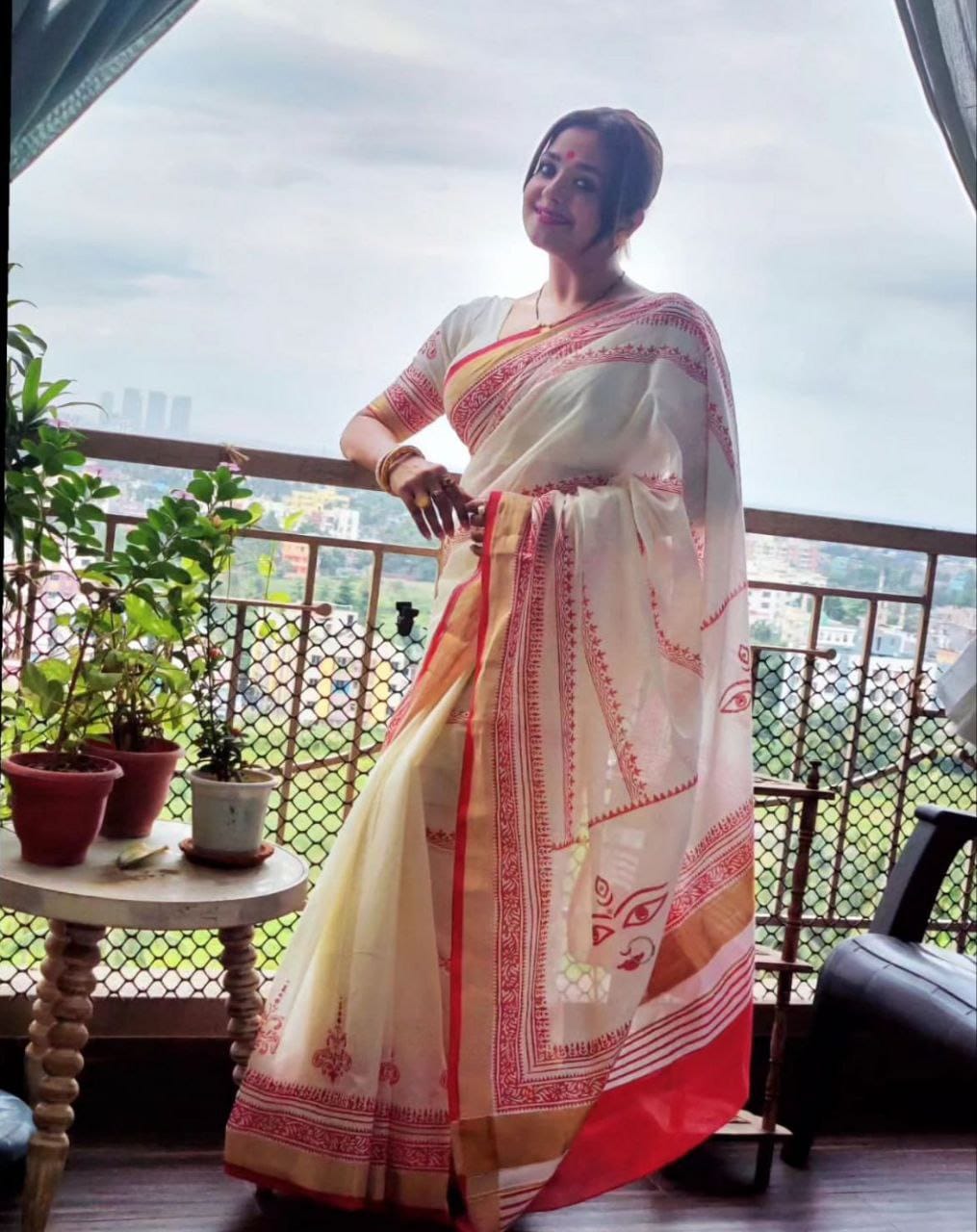 A lightweight and stylish drape, perfect for Durga Puja, Karva Chauth, festive gatherings, or casual elegance.