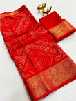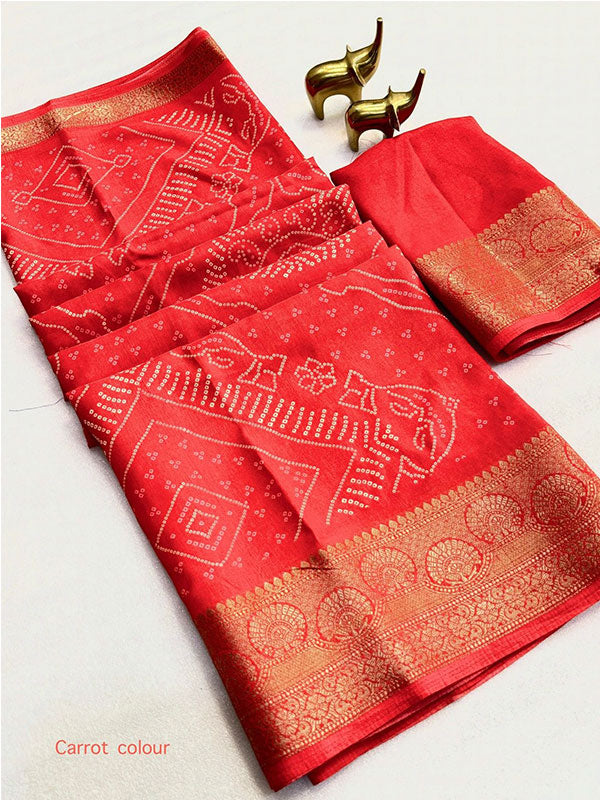 Step into ethnic elegance with this exquisitely crafted Soft Dola Silk Saree, designed to give you a graceful and festive look. The rich textures and vibrant bandhani print make it a perfect choice for weddings, traditional gatherings, and celebrations.
