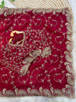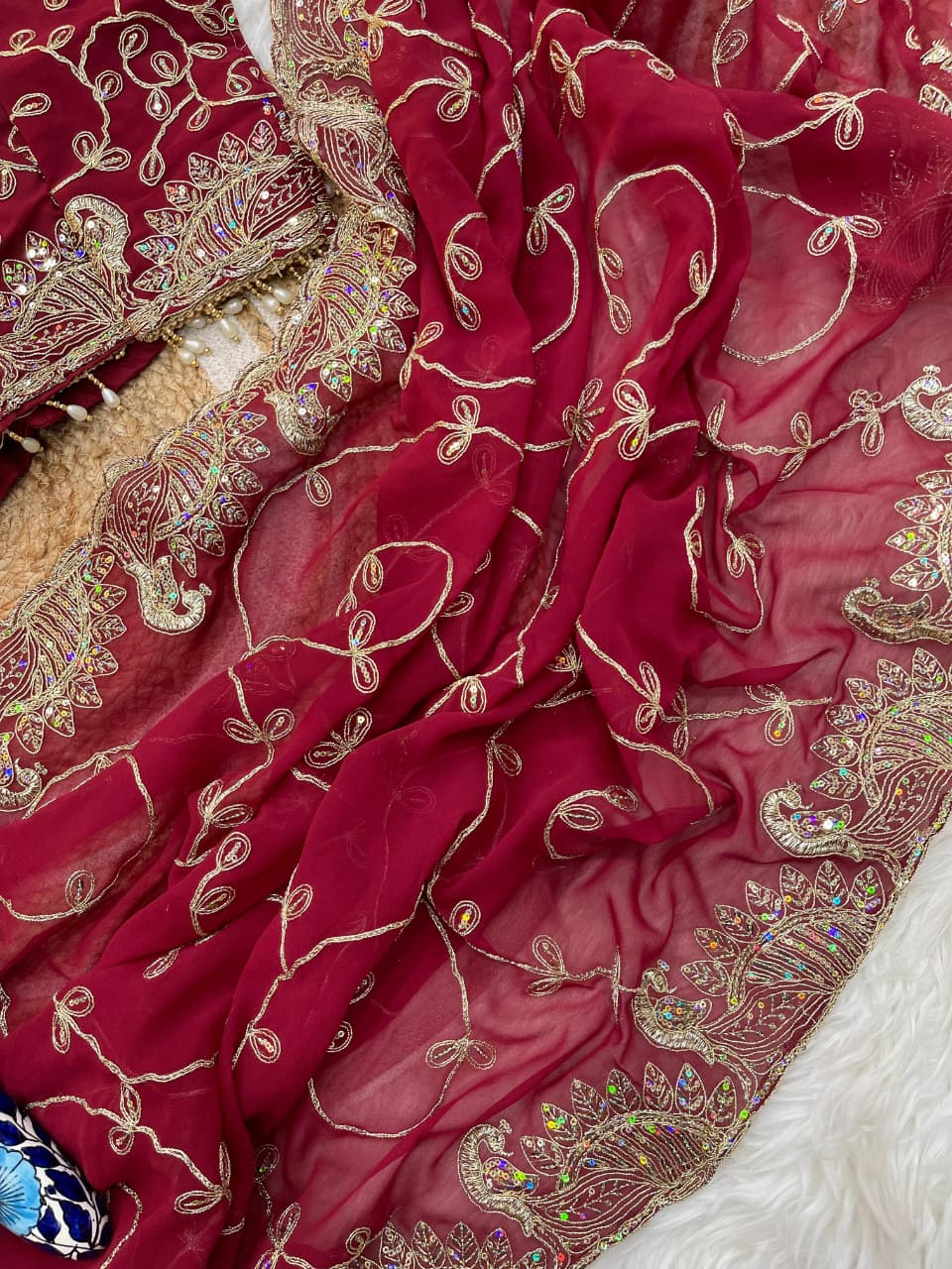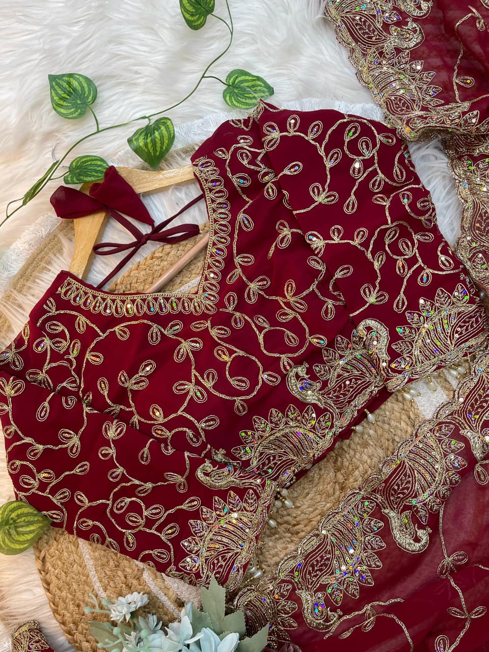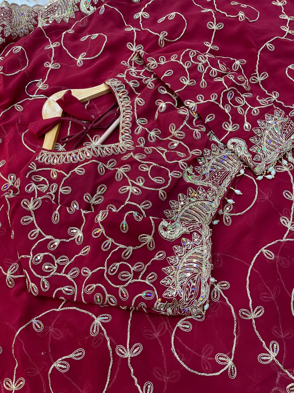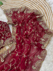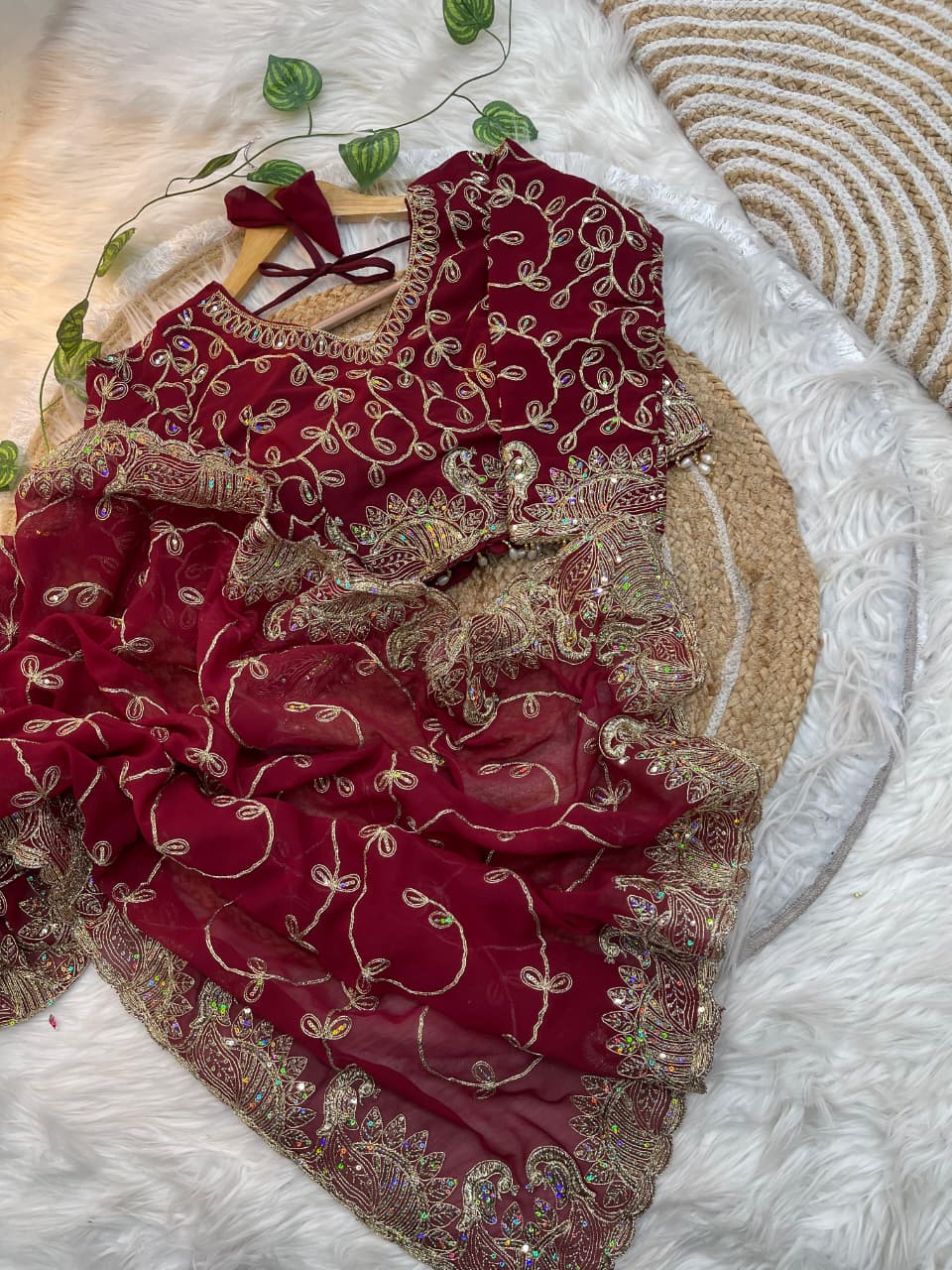Exude elegance with this very soft and lightweight georgette saree, adorned with intricate cording embroidery, 3 mm sequin work, and a richly detailed heavy border. The all-over jhal embroidery work adds a touch of grandeur, making it a statement festive drape.