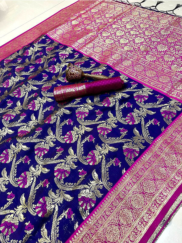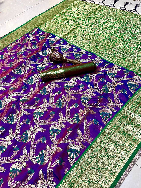 Make a bold style statement with this Super Hit Pure Soft Banarasi Silk Saree, exquisitely crafted with original gold zari work, rich designer motifs, and a luxurious heavy weaving pallu. The intricate Banarasi craftsmanship is enhanced by a vibrant contrast border, adding a royal charm to your festive or wedding look.