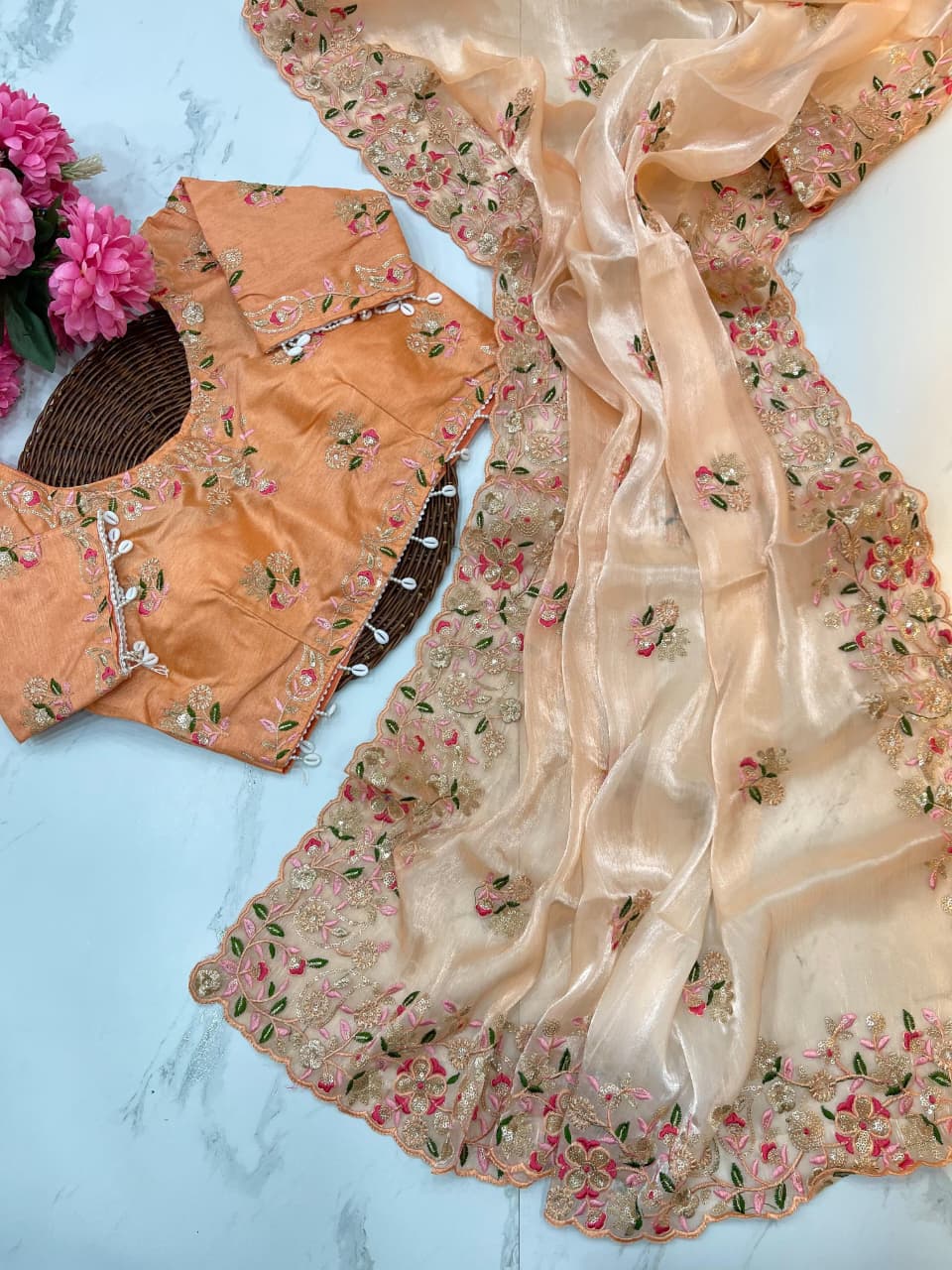 Elevate your ethnic style with this Very Soft & Elegant Fendy Chiffon Pedding Saree, crafted to deliver a graceful drape with a rich, premium look. The saree is beautifully enhanced with 3 mm sequin embroidery, featuring a heavy designer border and delicate work buttis all over the saree.