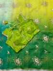 Paired with a fully stitched fancy-pattern blouse crafted from raw silk fabric, featuring embroidery work and mirror lace detailing, this saree is ready to wear and effortlessly stylish.