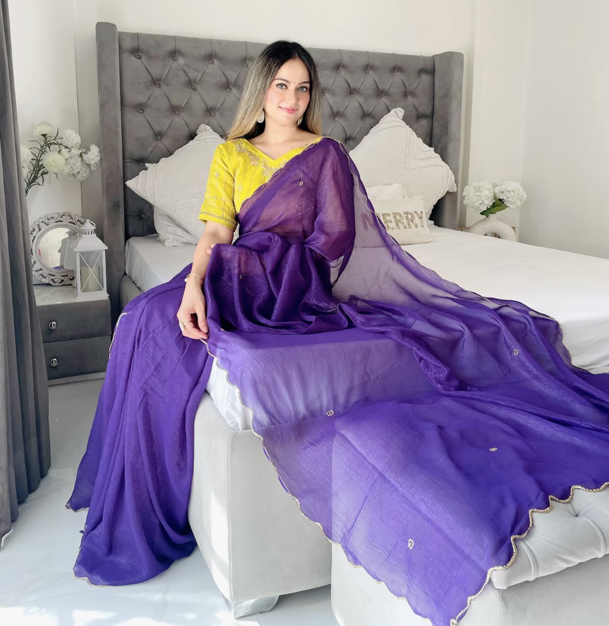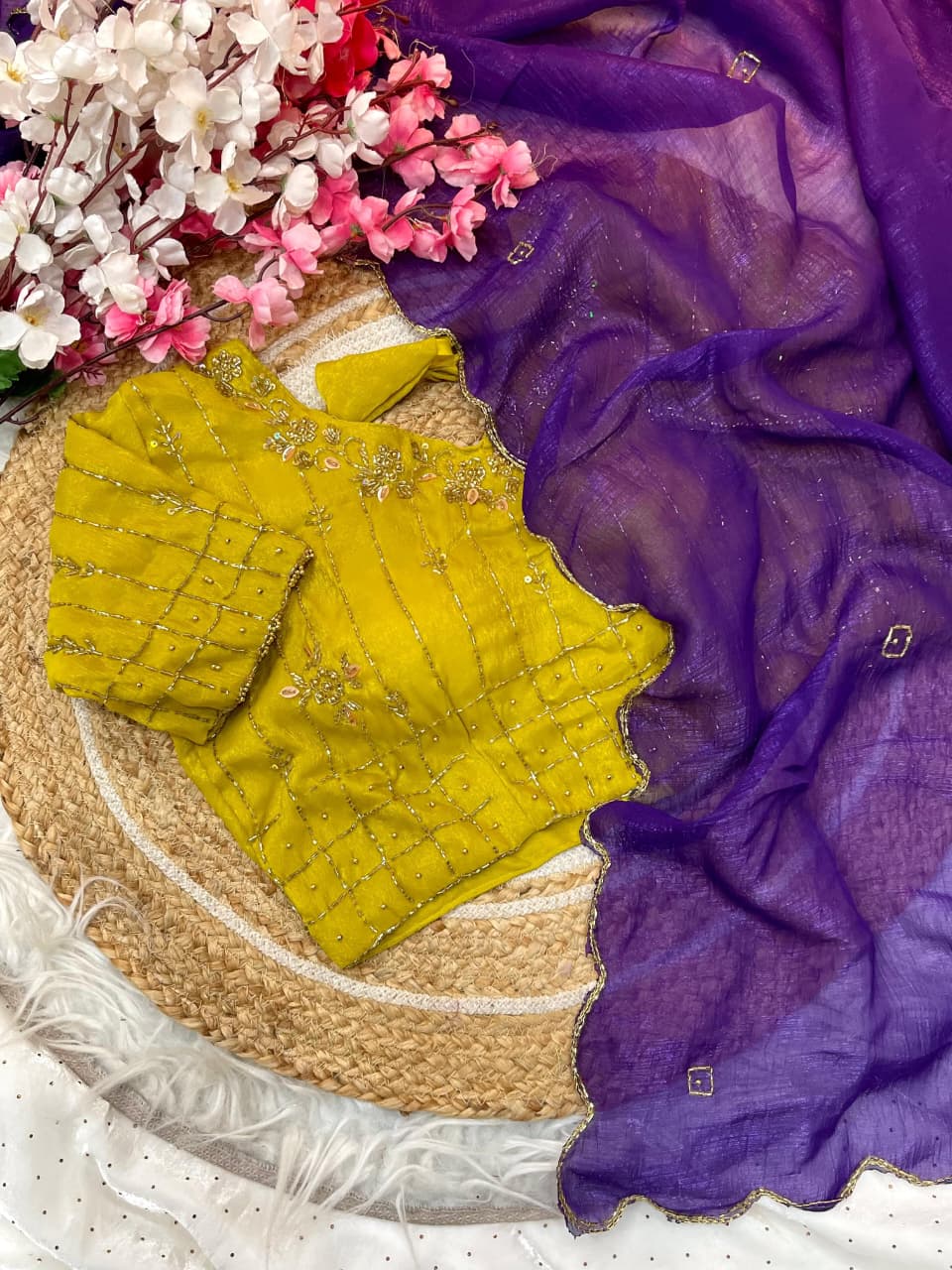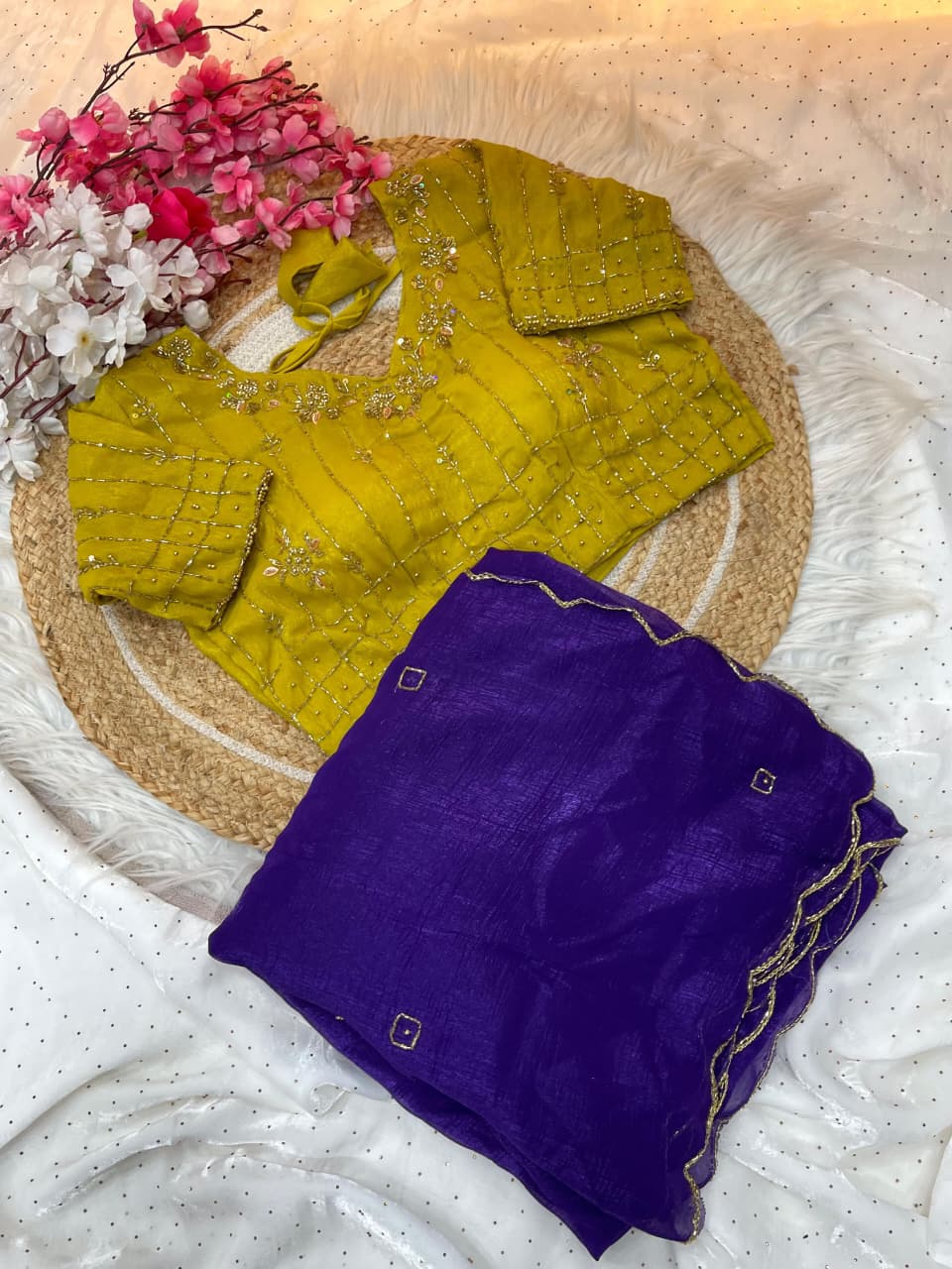 Paired with a fully stitched designer blouse made from running fabric, featuring a handwork necklace-style pattern enhanced with cutdana and moti touch-ups, this saree is ready to wear and effortless to style.