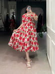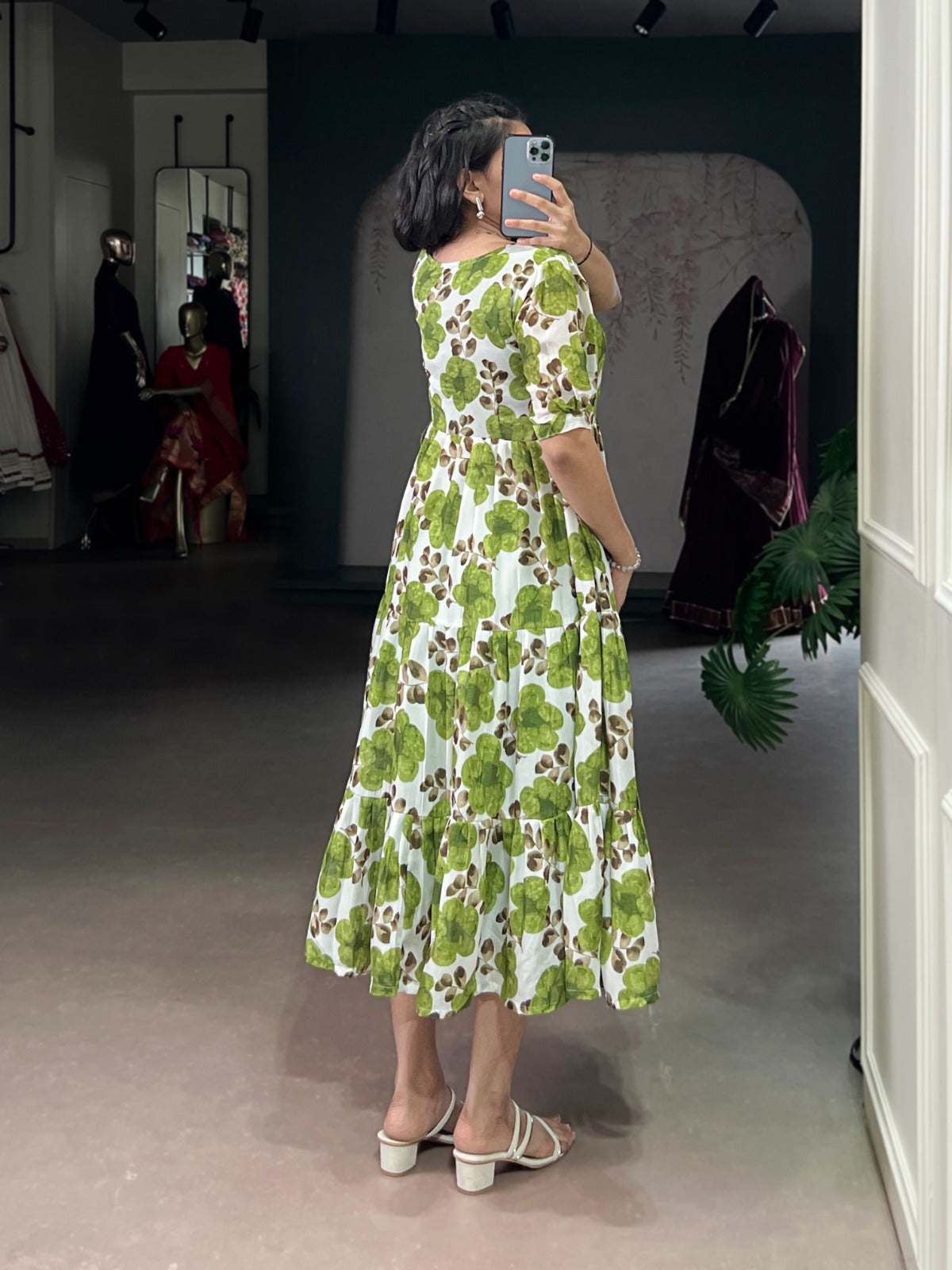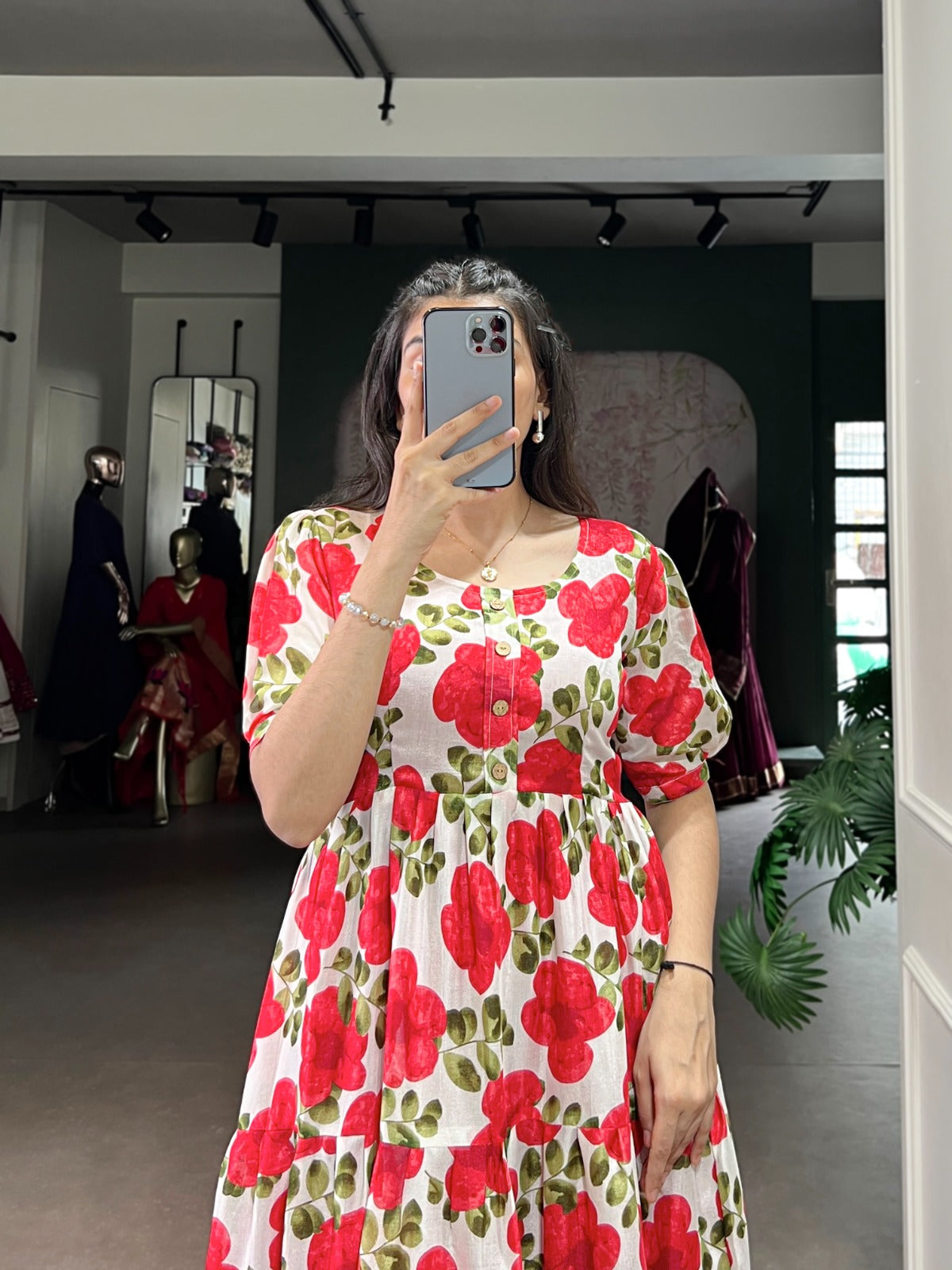 Drape yourself in soft florals and subtle sheen — pair this Vichitra Silk floral frock with ethnic jhumkas and juttis for a festive day look, or heels and clutch for an elegant evening style.
