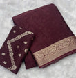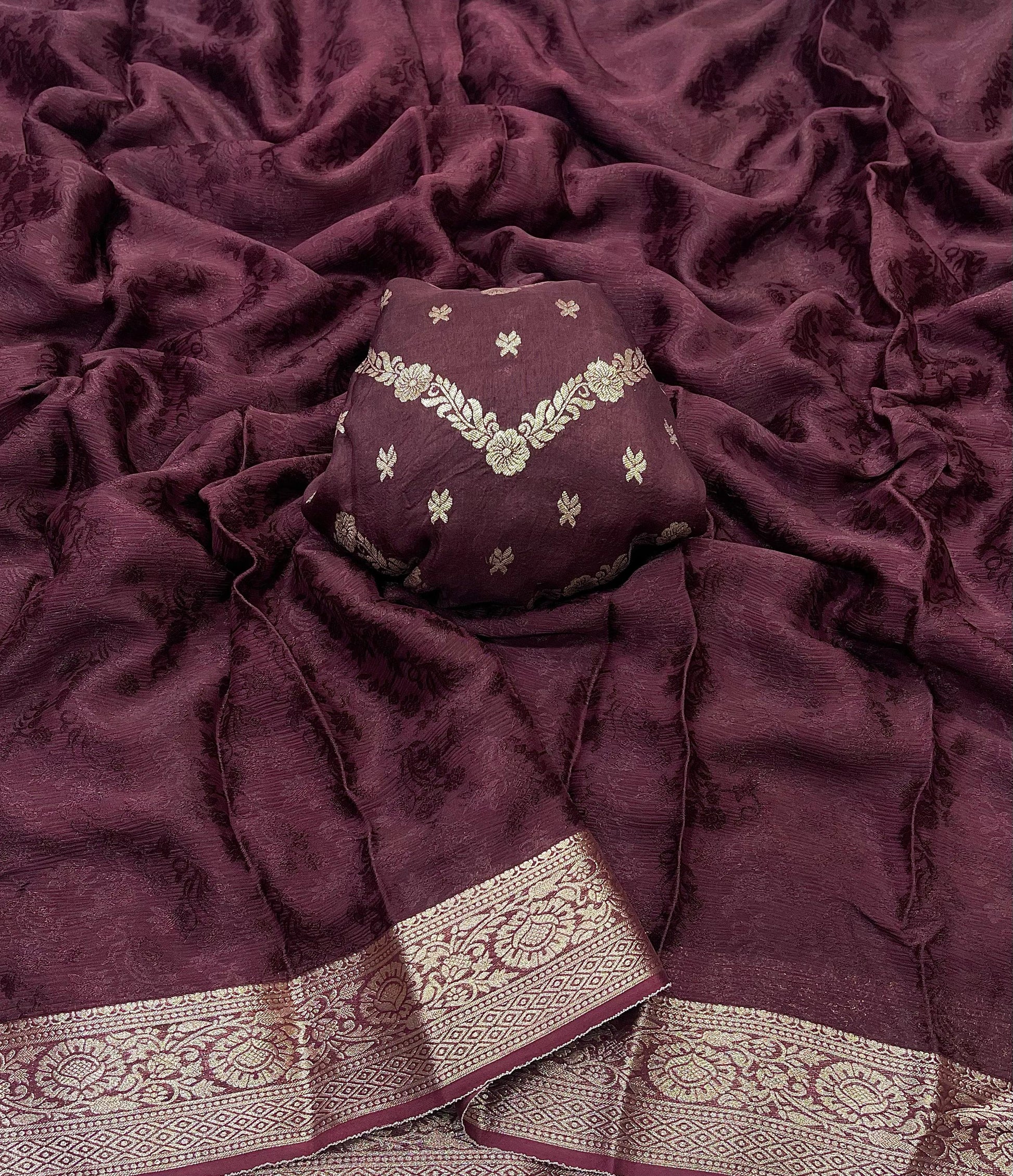 Step into effortless elegance with this Viscose Chinon weaving saree, crafted with a rich texture and graceful drape. The saree is paired with a luxurious Dola Banarasi Silk blouse, featuring traditional weaving patterns that exude sophistication.